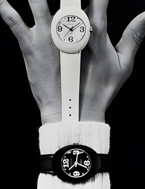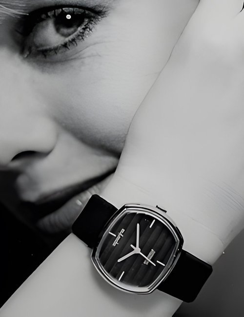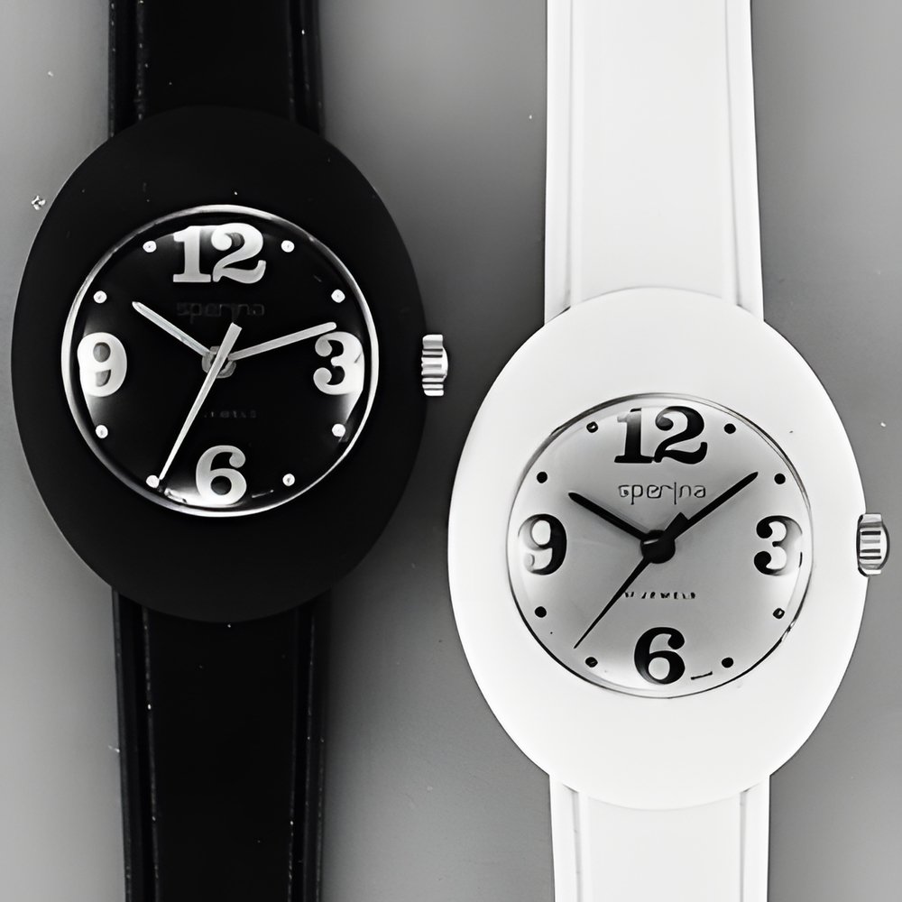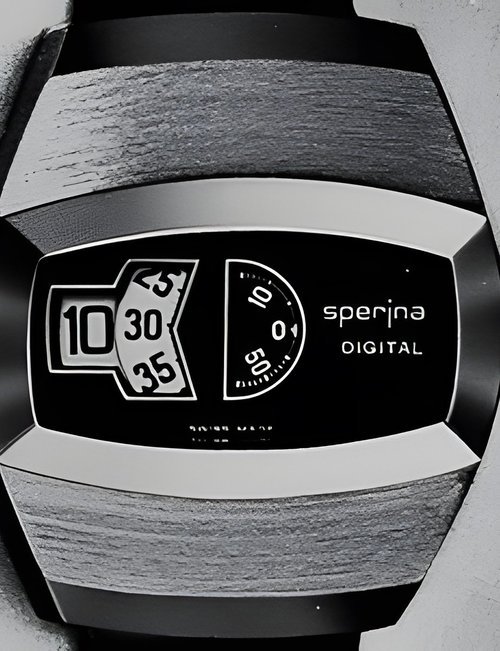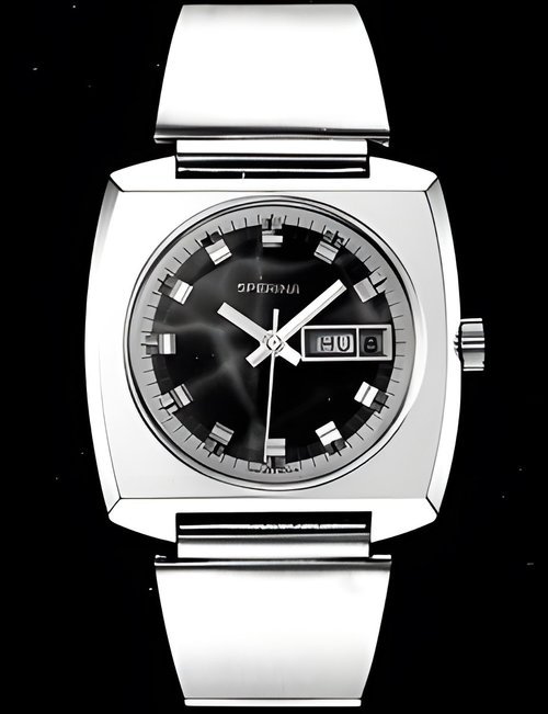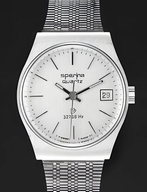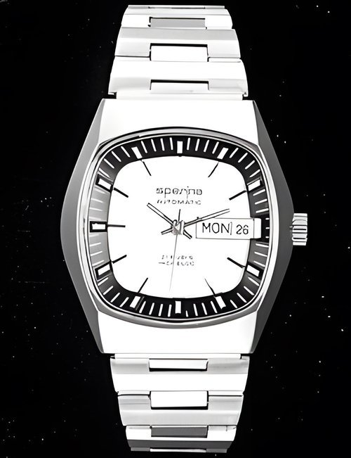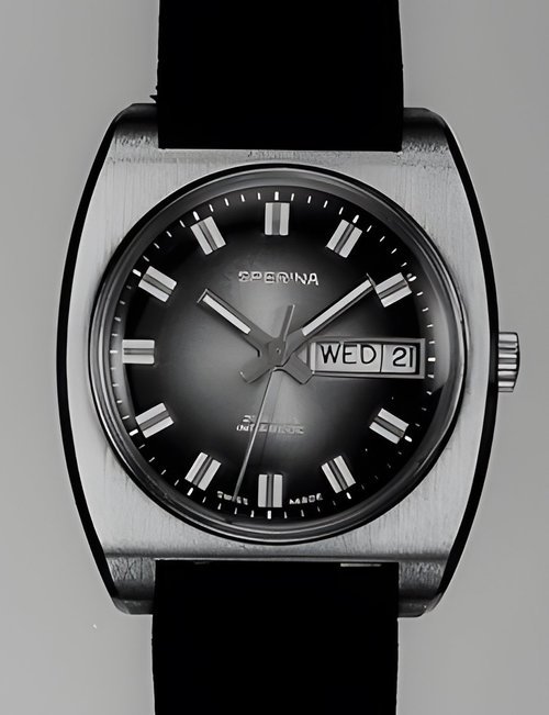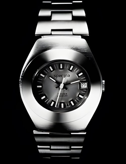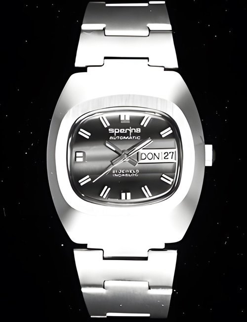 A youthfully styled model with spherical case. Its rounded lines are further emphasized by the large high-domed glass Broncinal gilt chromed or brightly coloured case. The synthetic bracelet is affixed inside the case. i or 17 jewels Roskopf (economical) movement, centre second hand (SPERINA)