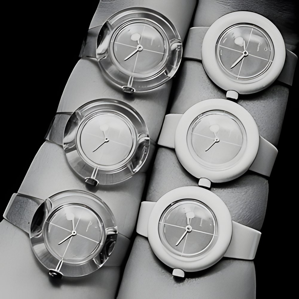 Extremely malleable, lights shock-resistant and corrosion-proof, brightly colourable : a host of qualities that are winning synthetics increased acceptance in watchmaking0 Cases are either transparent or opaque and brightly tinted. Choice of dial colours red, blue, yellow ... All representative of one of today’s most successful trends. (AGON)