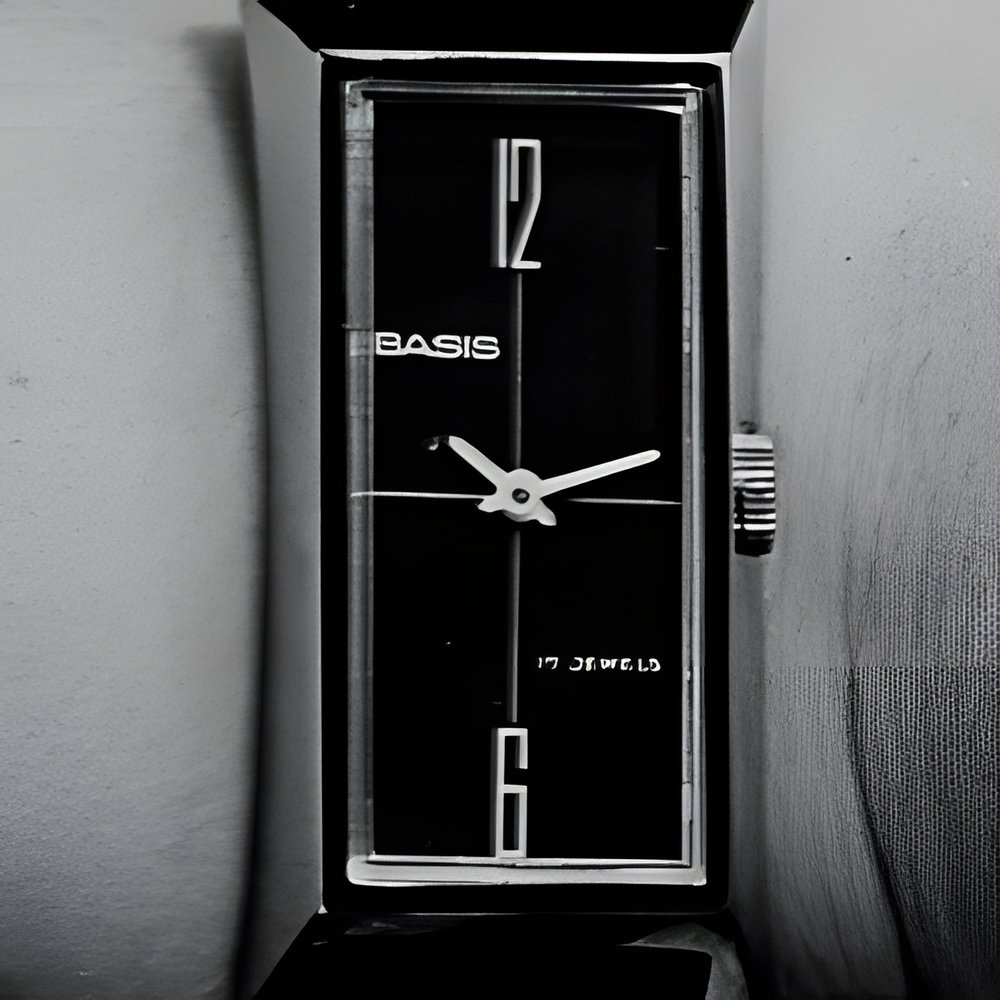 Long chromed case for perfect fit on the wrist, unadorned blue dial. A design for today : economical and elegant. (BASIS)