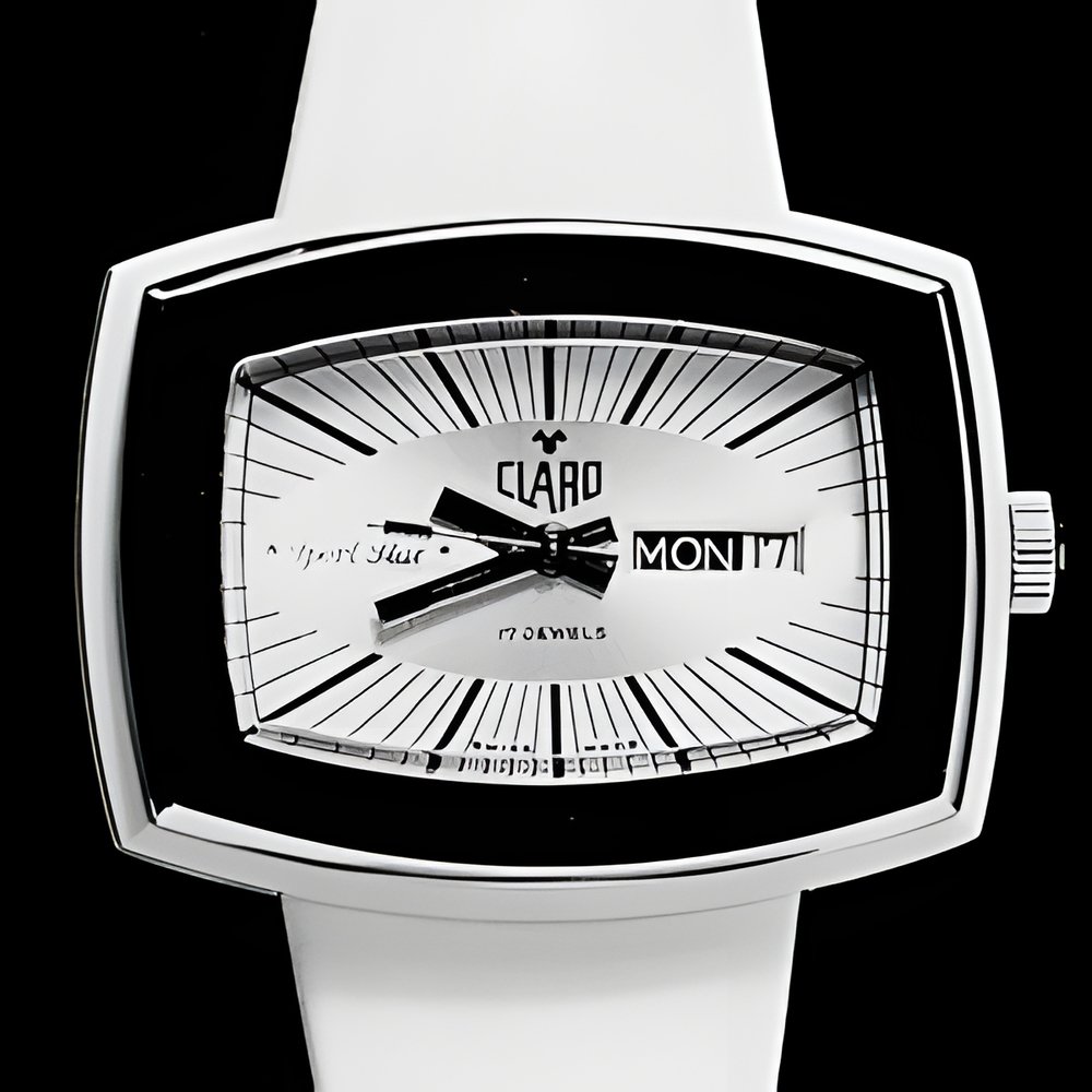 Watch manufacturers are increasingly turning to synthetic materials for watch cases and bracelets. This model, for example, has a case made of Noryl ; it is water-re sìstant to 5 atmospheres (50 metres under water). 15 jewels, centre second hand, day and date calendar. The bracelet is also made in a synthetic substance An economical model. (CLARO “Sport Stars”)