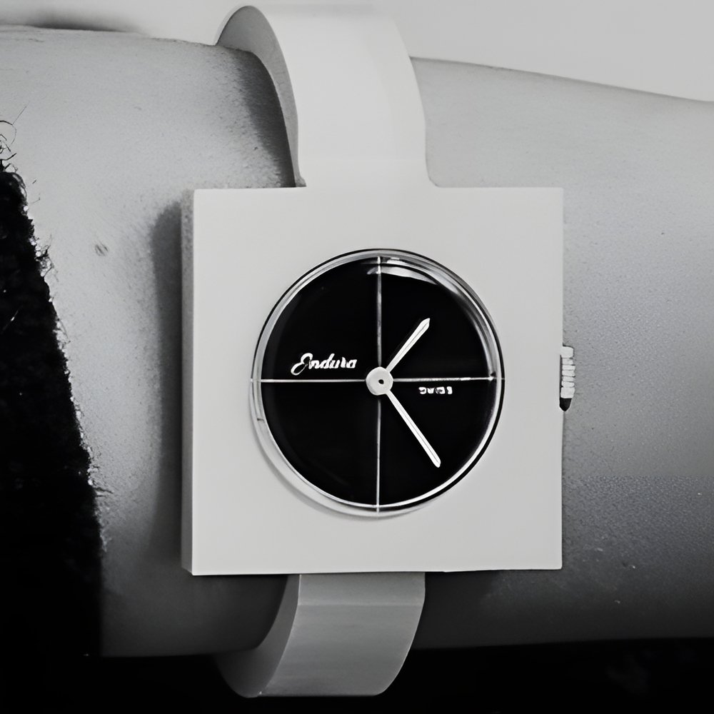 Because of their light weight and ruggedness, synthetics are increasingly in demand for watch cases. They also make for very attractive styling as is revealed by this white synthetic model with its contrasting black dial; the bracelet is made of the same material. (ENDURA)