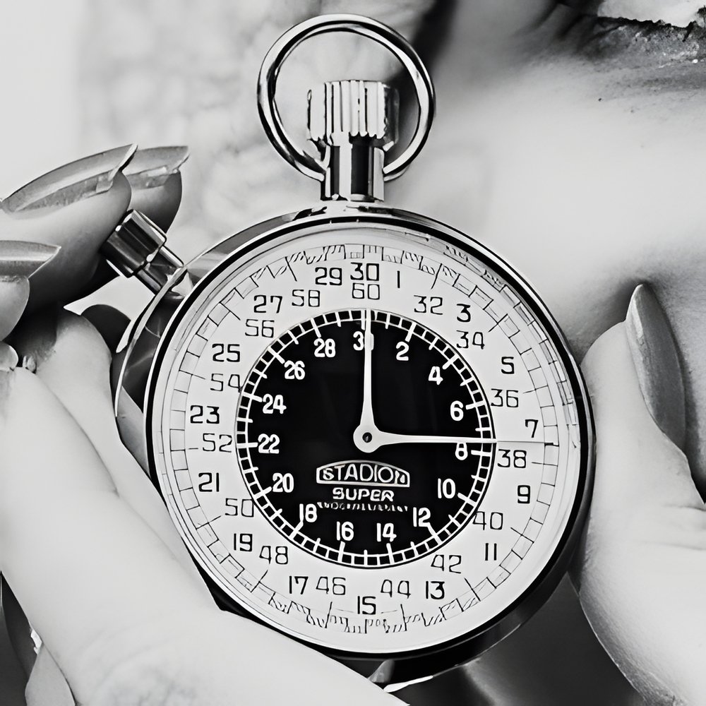 Sports timers are ideal for short-time measurements Economical models are available, such as this one whose second hand makes one revolution every 30 seconds Precise dial divisions for readings to the tenth of a second. With centre minute register (3O’) au centre. (ILONA-STADION)