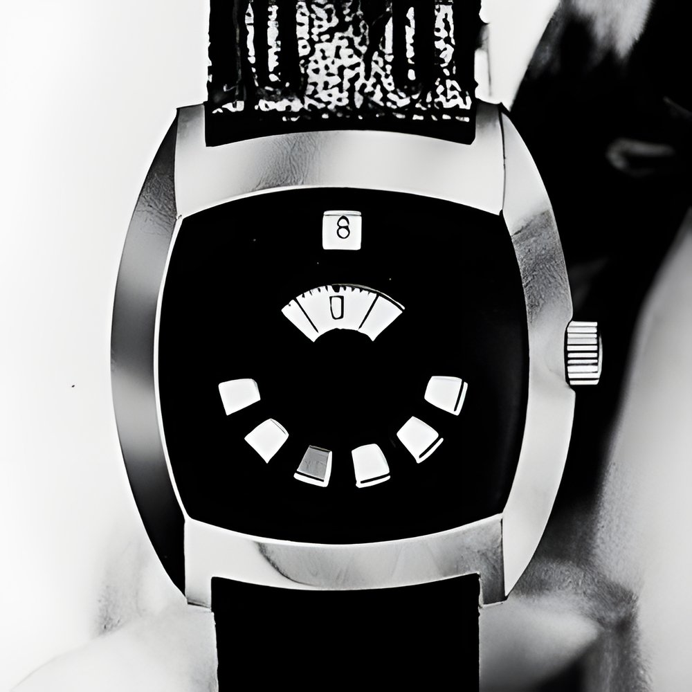 A new ay to read the time. Based on the binary system, this watch provides both an evaluation of elapsed time and the right time at one single glance a coloured dot in one of the 6 lower aperture gives the hours, the minutes appear in the centre aperture with the date visible in the one above. What’s more, there is not longer any risk of breaking the crystal. (SICURA “Pro Domo”)