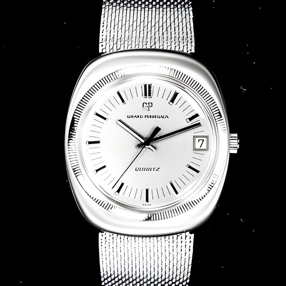 This new Girard- Perregaux model is equipped with a movement of proven quality and tens of thousands of units have already been produced. Quartz frequency is 32,768 Hertz The water-resistant case is in i B carat yellow gold. (At the Neuchâtel Observatory’s 1972 Chronometer Tests, 4 out of 5 batches of 16 watches apiece, chosen at random from a series of 1800 units, swept the first four places after 38 days of static and dynamic testing.) (GIRARD-PERREGAUX)