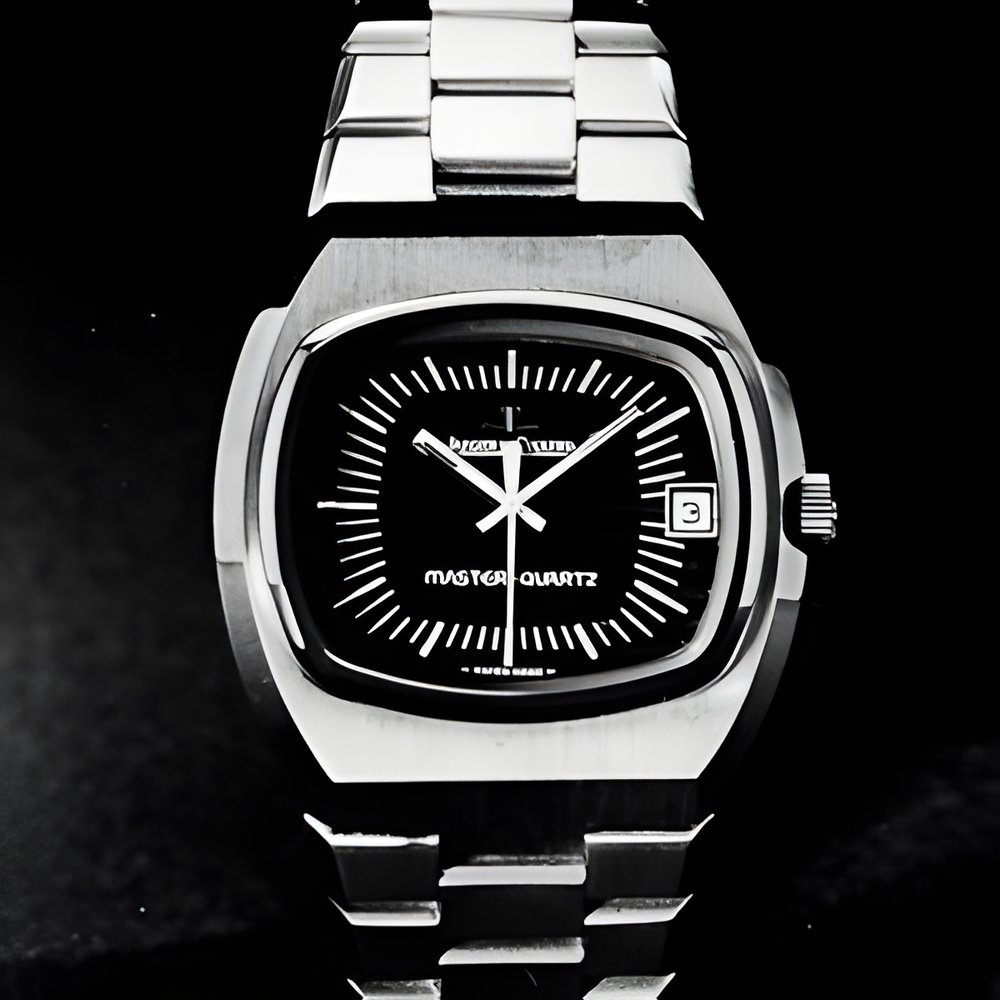 This new quartz electronic model is now in quantity production. Its quartz frequency of 32,768 Hertz is divided down to 0.5 Hertz to action the stepping motor. Its electronic circuit contains 312 C-MOS components on 5 sq. millimetres. (JAEGER - LECOULTRE “Master-Quartz”)