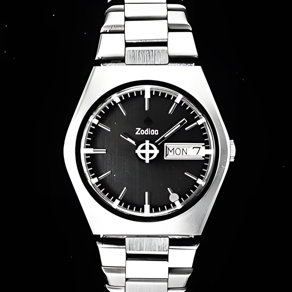 The red dot of the Zodiac-Astrografic collection is now also controlled by quartz movement Frequency : 32,768 Hertz, stepping motor. Quick-reset day and date calendar. And the movement is very compact in design 575 mm thin and 29 mm in diameter. Annual rate variation is less than one minute (ZODIAC “Astroquartz”)