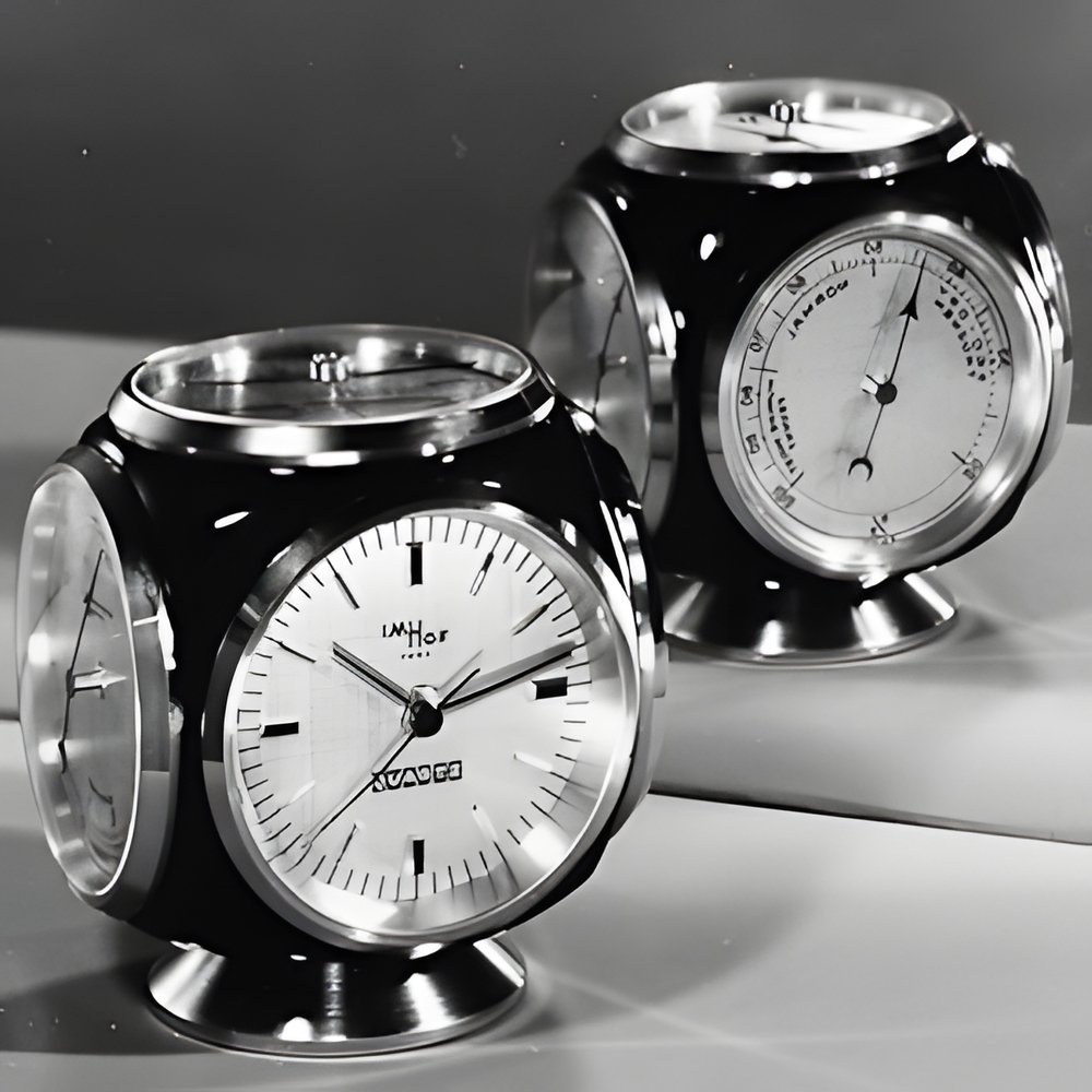 The smallest 4-sided (barometer-thermometer-hygrometer-compass) pivoting table clock with quartz electronic movement The movement is the new Swiss design created specially for clocks. Its small dimensions are ideal for this purpose Ø 54.1 mm, height 21.5 mm Quartz frequency is 32768 Hertz i 35 V battery. Guaranteed regulated to less than 60 seconds ’ variation ayear0 The clock is finished in wine-red lacquered and flamed solid metal With gilt dials. (IMHOF)