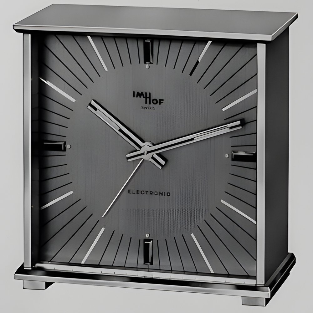 This small electronic clock in gilt metal is equipped with a very nev driving balance electronic movement, all components of whichincluding i 55 V battery - fit inside the alarm belle Its overall dimensions are Ø 541 mm, height 21.5 mm This model is also j notable in that it has a bell unusual for electronic alarms being designed for people who cannot stand ultrasonic vibrations. Guaranteed regulated to less than 6 seconds ’variation per day. (IMHOF “Resonich”)