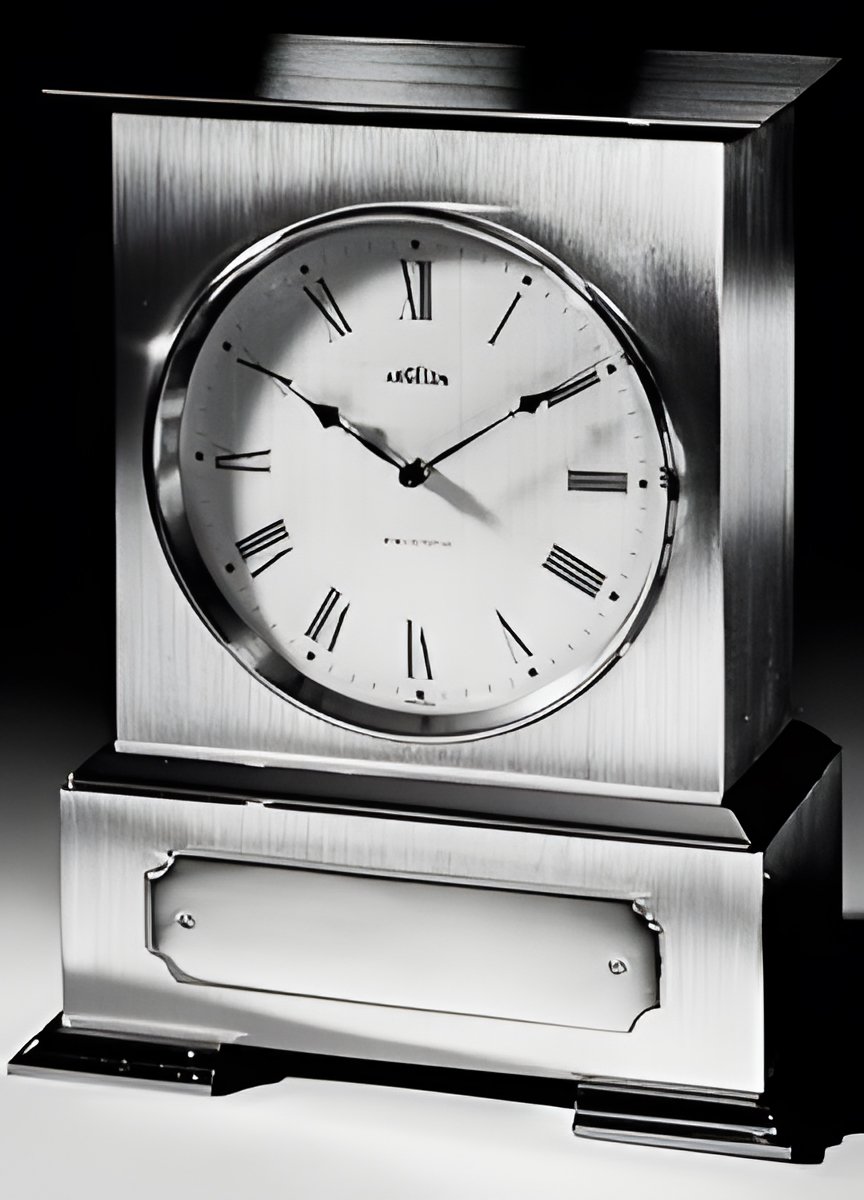 Gracefully and classically styled table clock in polished gilt metal, with small plaque for engraving an inscription. Fitted either with a quartz electronic movement (annual rate variation i minute) or with an 8-day movement with chimes (ANGELUS)