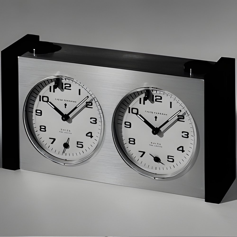 Finally, a timing instrument designed with chess players in mind. It features a pair of dependable 1-day movements, two large and reliable start-and-stop buttons 9 a very accurate playing time expiration signal. The dials are very legible and the minute circles stress the last 1 5 minutes. Rate monitoring hand. Solid wood and metal construction. The prototype model was tested at the 6th International Chess Congress in Bienne. (LOOPING “Chess Champion”)