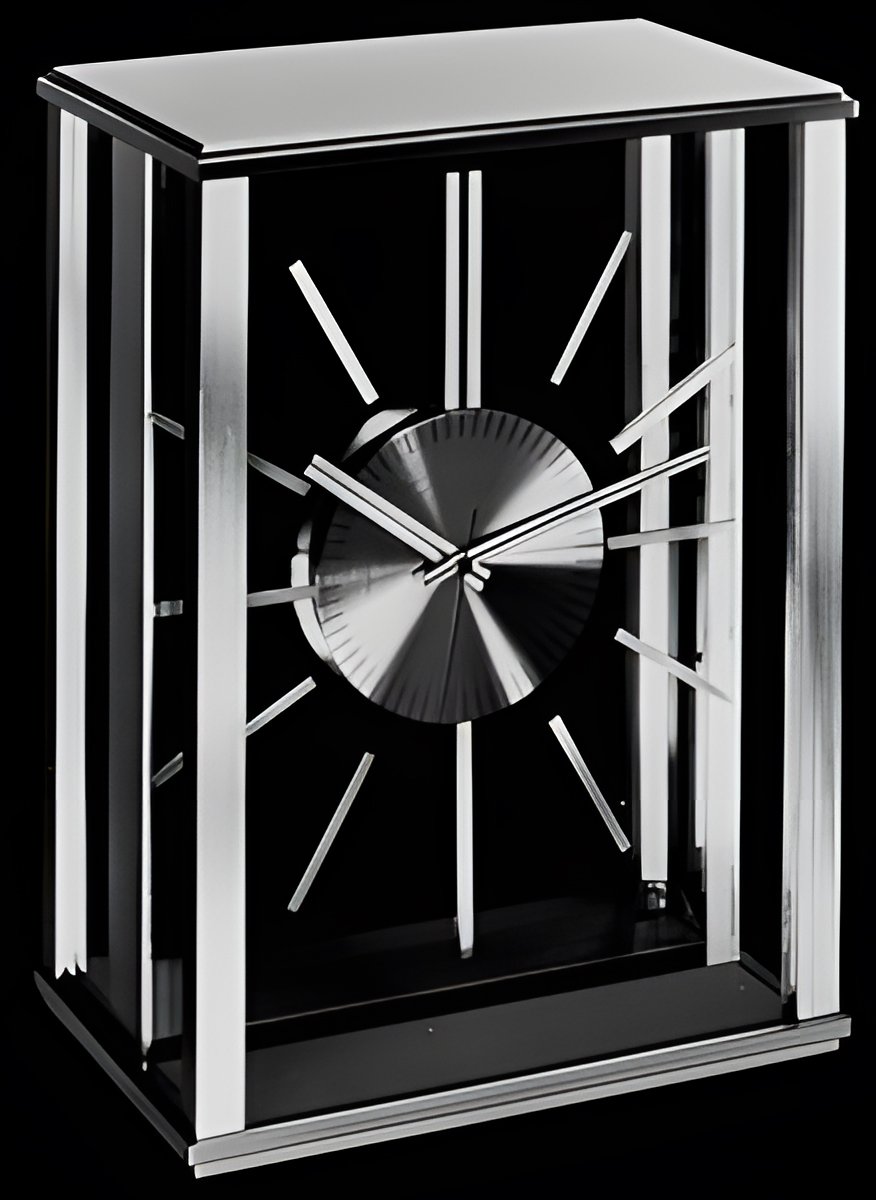 A “pillar clock” in crystal and gilt (or steel grey) metal ; placed either upright or against the wall with a removable bracket. Dial with raised and polished markers. Its “Imhof -Quartz” movement beats the second and is guaranteed adjustable to less than one minute a year. (IMHOF - “Quartz”)