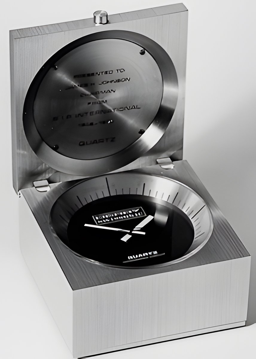 This solid metal, gilt-finished case contains a quartz electronic movement accurate to within about one minute a year. Derived from the marine chronometer displayed last year, it is designed as a desktop clock but, being fitted with an 0-ring watertightness joint, can also be used aboard ship. The inside cover plate can be removed for engraving an inscription, initials, etc. (DERBY SWISSONIC)