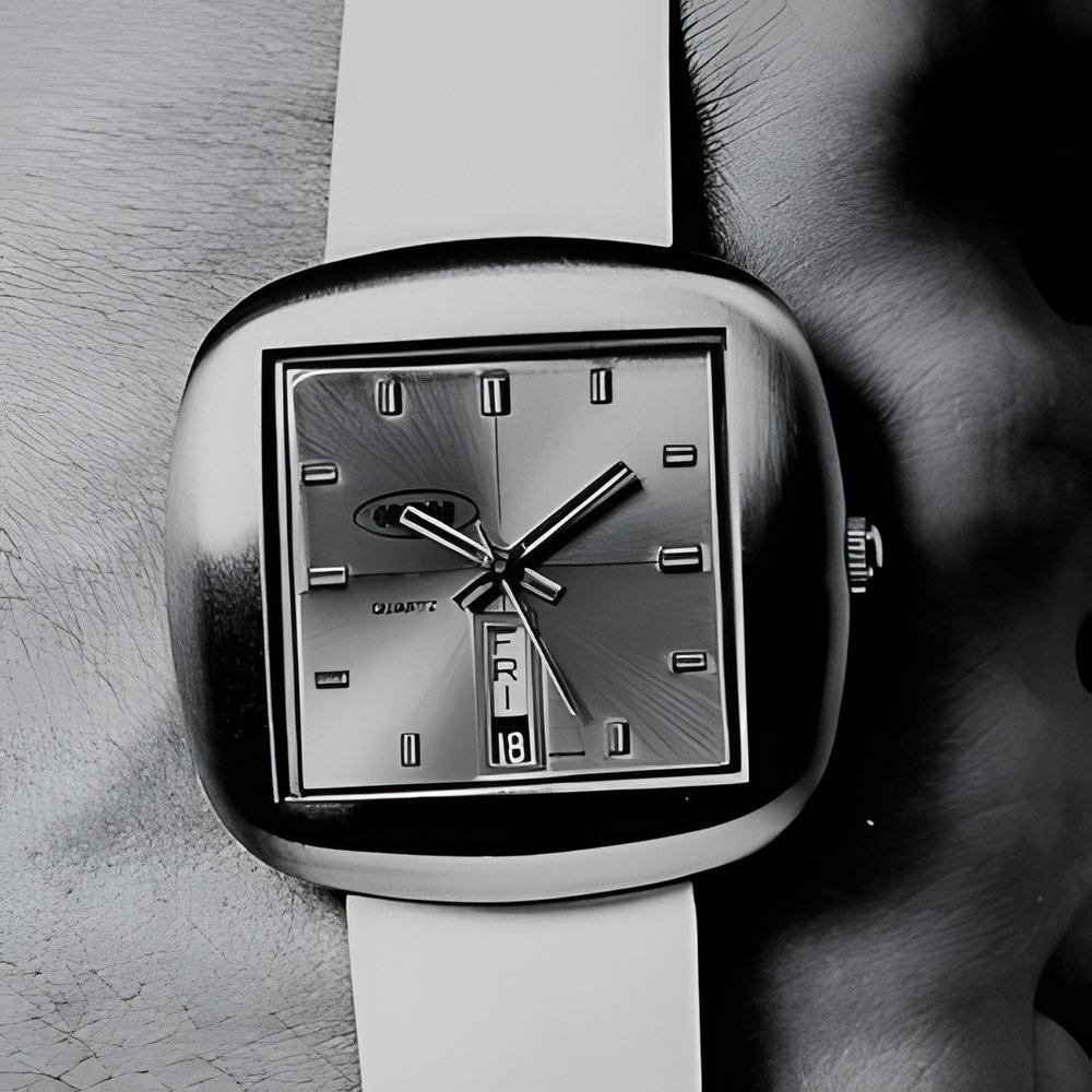 Surprises never end in Basle quartz electronic wristwatches make their debut in the showcases of manufacturers of economical watches. Here is one of these new models : its quartz vibrates at 32,768 Hertz, it has a stepping motor and a day and date calendar. The monthly variation is expressed in seconds. Large water-resistant case with rounded sides. (OBERON - Quartz)