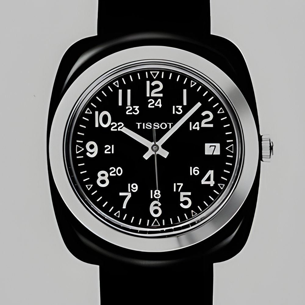 The functional look: a perfectly legible traditional dial and black chrome case water-resistant to 3 atmospheres (a depth of 30 metres). The movement itself has equivalent characteristics: it is made of the inalterable material Tissot has introduced under the name ’Sytal’ (“Systeme total d’autolubrification” = Fully Self-lubricating System), requiring no maintenance whatsoever. (TISSOT “Sytal”)