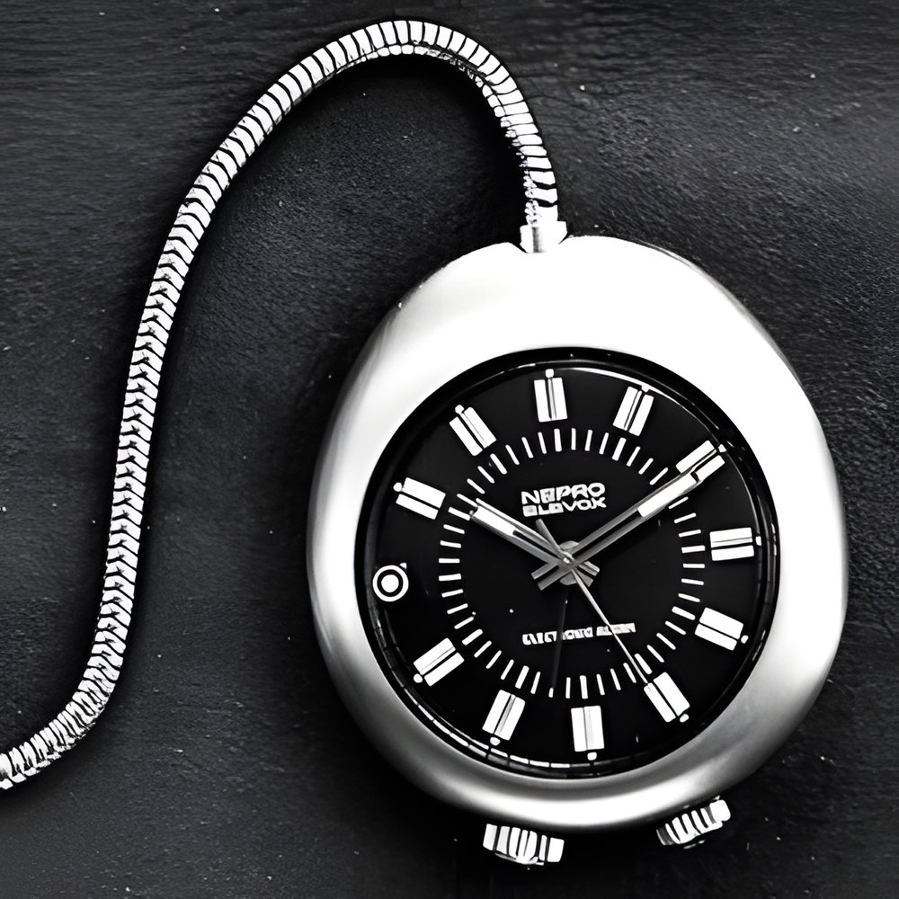 Very popular today : pocket watches with an alarm system. Long chain and electronic alarm ; the buzz is produced by the resonance of the crystal that protects the dial. (NEPRO “Elevox”)