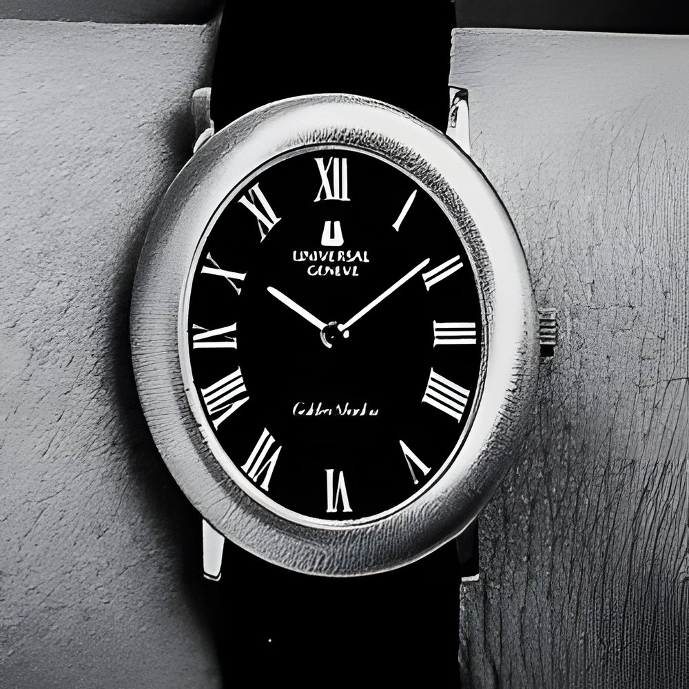 Universal is introducing in Basle a new “Golden Shadow” collection exclusively composed of ladies ’ watches They are fitted with an ultra-thin (2.5 mm thick at most) seifwinding movement mounted on ball bearing, four of which are built in directly, a technical feat in this type of thin movement. It is shock-protected. The watch pictured here is in 18 carat gold with bassine-shaped case (rounded flanks), slate dial and large Roman numerals. (UNIVERSAL GENEVE “Golden Shadow”)