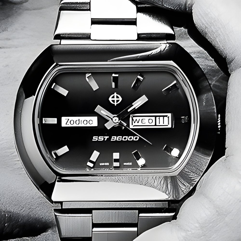 Absolutely similar except for size are these two new models from the Zodiac SST 36000 collection, With high frequency automatic movement and day-date calendar. Shaded colour dial and high-rise hour markers. The waterresistant steel or goldplated cases display the softly rounded lines so popular today. (ZODIAC SST 36000)