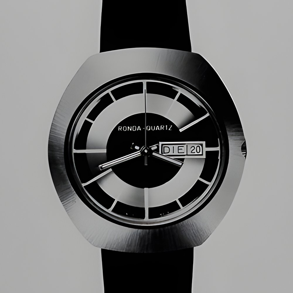 No that its manufacturing technology has been fully developed arid that the after-sales service system is ready, Ronda have begun marketing their new quartz electronic movement. Its characteristics are as follows : frequency 32 KHz, C-MOS integrated circuits, stepping motor, i 05V battery with 18-month life, stop-second system and day and date calendar. The electronic module (the quartz and the circuits) can easily be removed for standard replacement. Low movement height and economical price. (RONDA - Quartz)