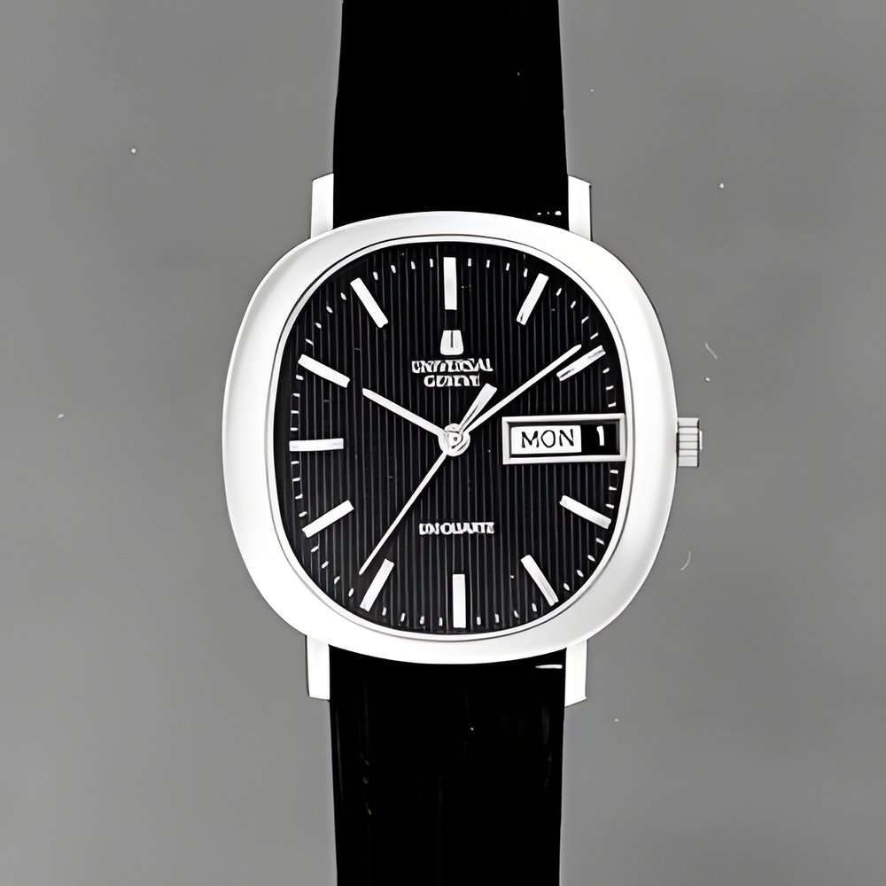 A gracefully and elegantly styled quartz electronic watch fitted with the Uniquartz movement, notable for its i compact dimensions 18 carat yellow gold case, day and date calendar. Technical characteristics quartz frequency 32,768 Hz, tuning fork 341.33 Hz, O-MOS integrated circuit, movement height 53 mm. (UNIVERSAL “Uniquartz”)