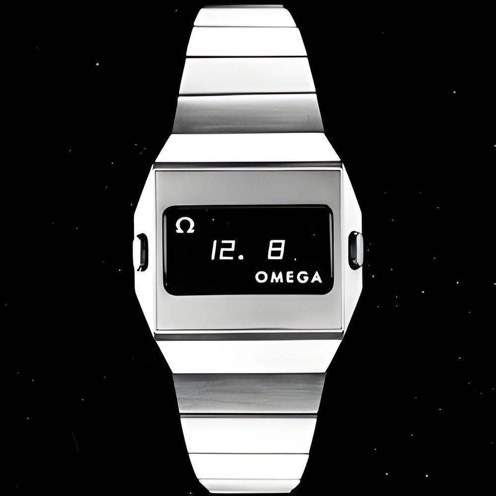 Omega’ s new 1 OO electronic Time Computer (known as the Omega Digital in USA and Canada) is equipped with a month and date calendar. Its digital time display uses light-emitting diodes (active display). Pressing on the righthand button causes the hour and minutes to appear for 1 25 seconds, followed by a flash-by of the seconds. Pressing the left-hand button causes the month and date to light up (illustration : at left, the month ; at right, the date). The point between indicates a.m. time when it appears above and p.m. time when it appears below - a useful indication when changing the date. This model will be on the market by the end of the year. (OMEGA “Time Computer”)