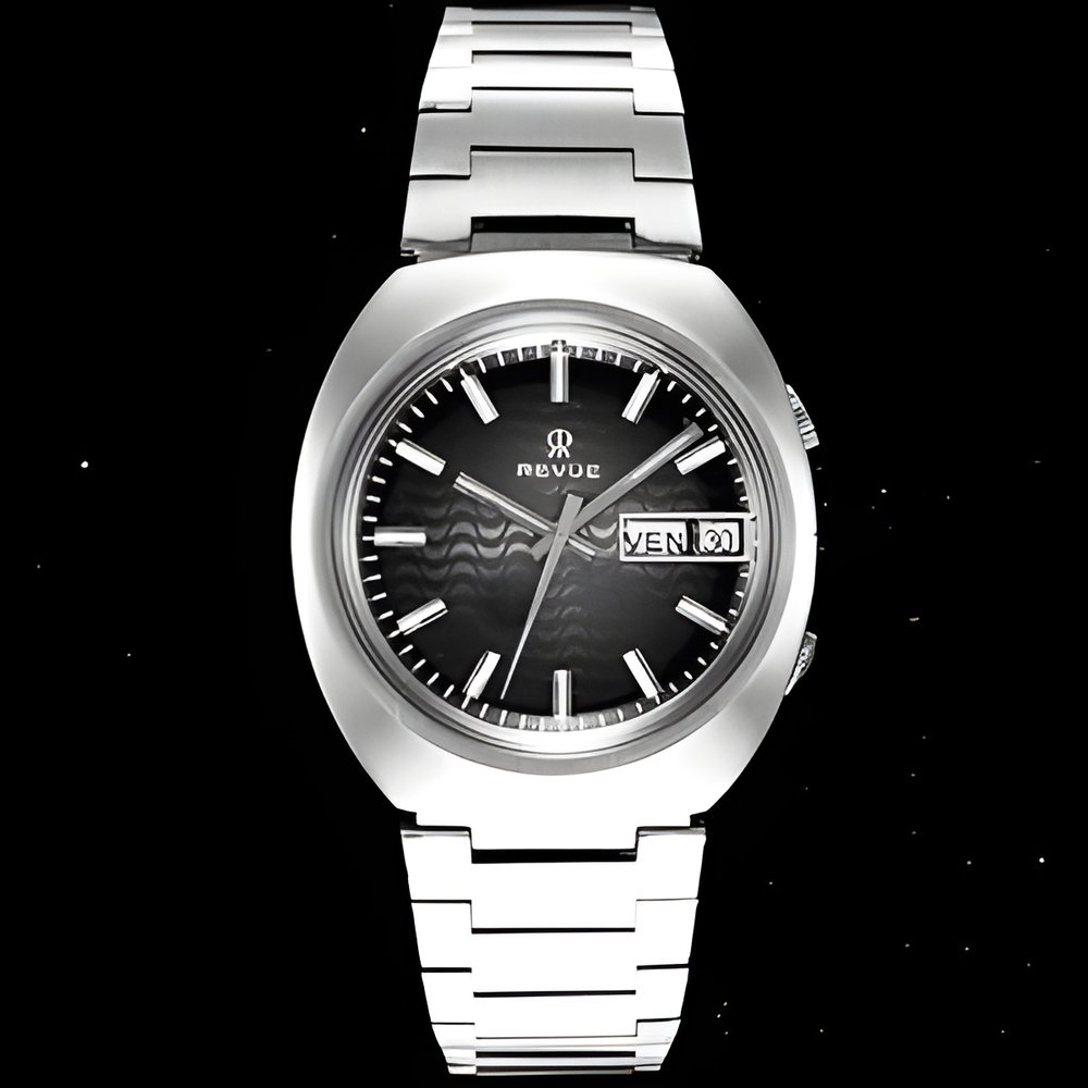 This electronic ’wristwatch boasts a quartz that vibrates 1 ,548,288 times every second Such a performance could only be achieved by cutting the quartz in the form of a wafer and developing a single integrated circuit capable of dividing such a frequency. It is of the C-MOS, single-division, high-ratio type and comprises 342 transistors. This all-steel, water-resistant watch with integrated bracelet has a precision of the order of 1 to 2 seconds per month only. (REVUE “MSR Quartz 1 ,5 MHz”)