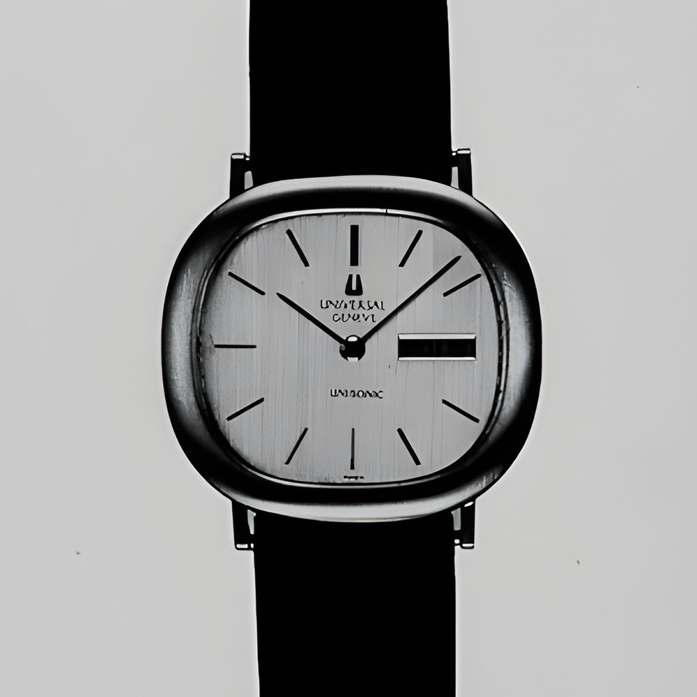A day and date calendar for this lady ’ s tuning-fork electronic watch (frequency 480 Hz) on display in Basle this year. Great pains have been taken to miniaturize the movement for the strikingly elegant models it equips.(UNIVERSAL “Unisonic”)