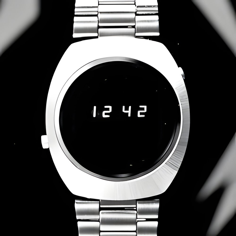 A ne; feature in the field of electronic time display by means of light-emitting diodes (LED - an active display system with its own light One press on the right-hand button and the hours and minutes flash on the screen. A press on the left button and the date appears. Pressing on both buttons simultaneously produces the seconds flash-by. This watch’s module includes : quartz vibrating 700,000 times per second. Correction of about 2 seconds a month, adjusted by trimmer. (NEPRO “Quartz LED”)