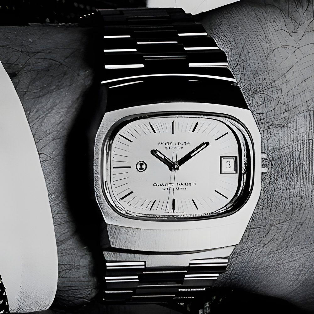 Integrated case arid bracelet with “Full Flow” styling for this newcomer in the quartz electronic field Quartz frequency 32 768 Hertz, C-NOS circuit with 312 components , stepping motor. Large transversal dial with calendar. (FAVRE-LEUBA "Quartz Raider’)