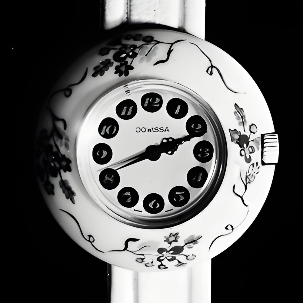 Springtime freshness is the dominant mood with this generously proportioned watch whose synthetic case is decorated with multicoloured flowers. On the dial are cartouches framing paintedhour figures. (JOWISSA “Printemps”)