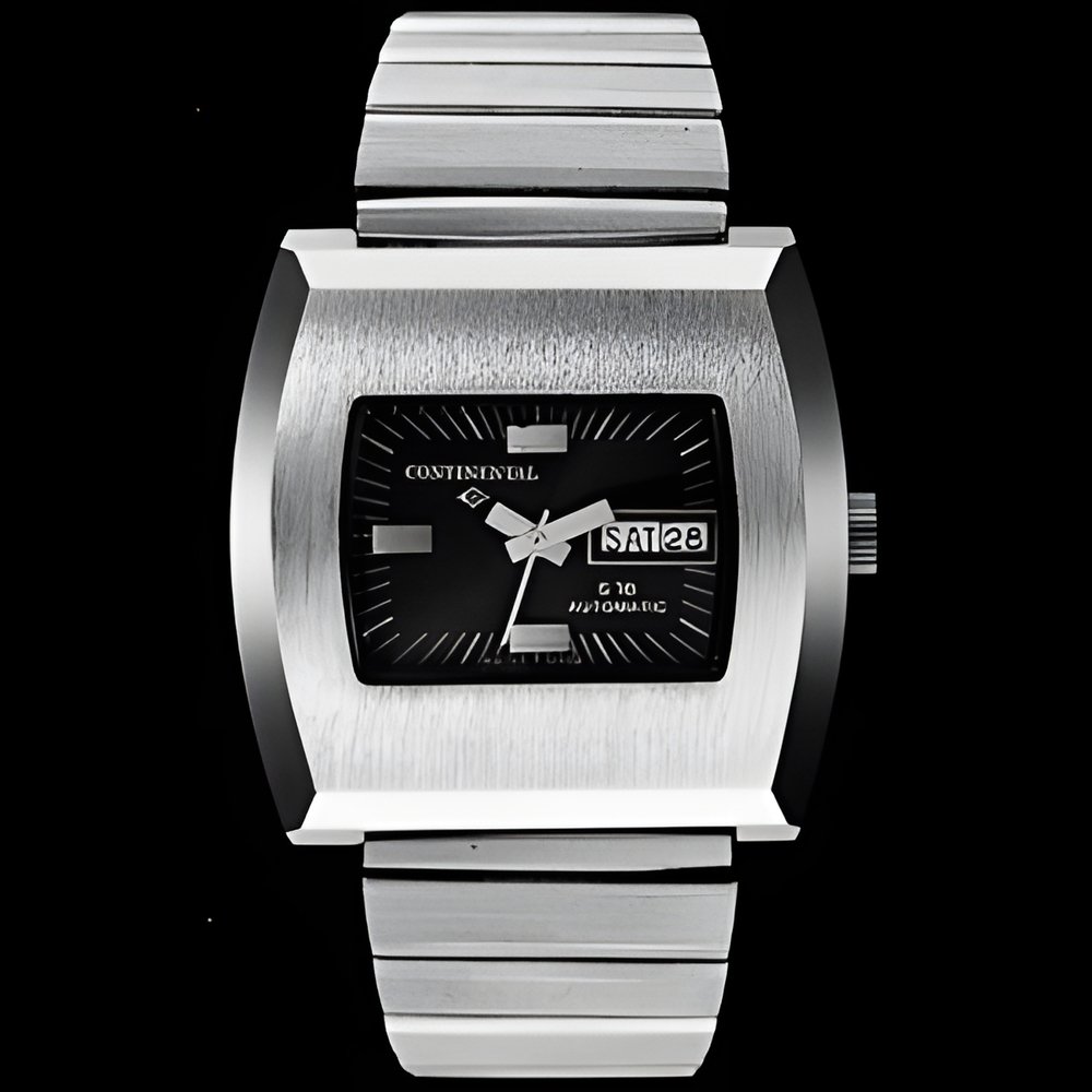Today, economical watches are notable for their technical characteristics as well as their styling Here is a man’s watch with seifwinding movement, day and date calendar and case water-resistant to 3 atmospheres (30 metres) Integrated bracelet and modern case styling with polished bevelling. (CONTINENTAL S 78 Automatic)