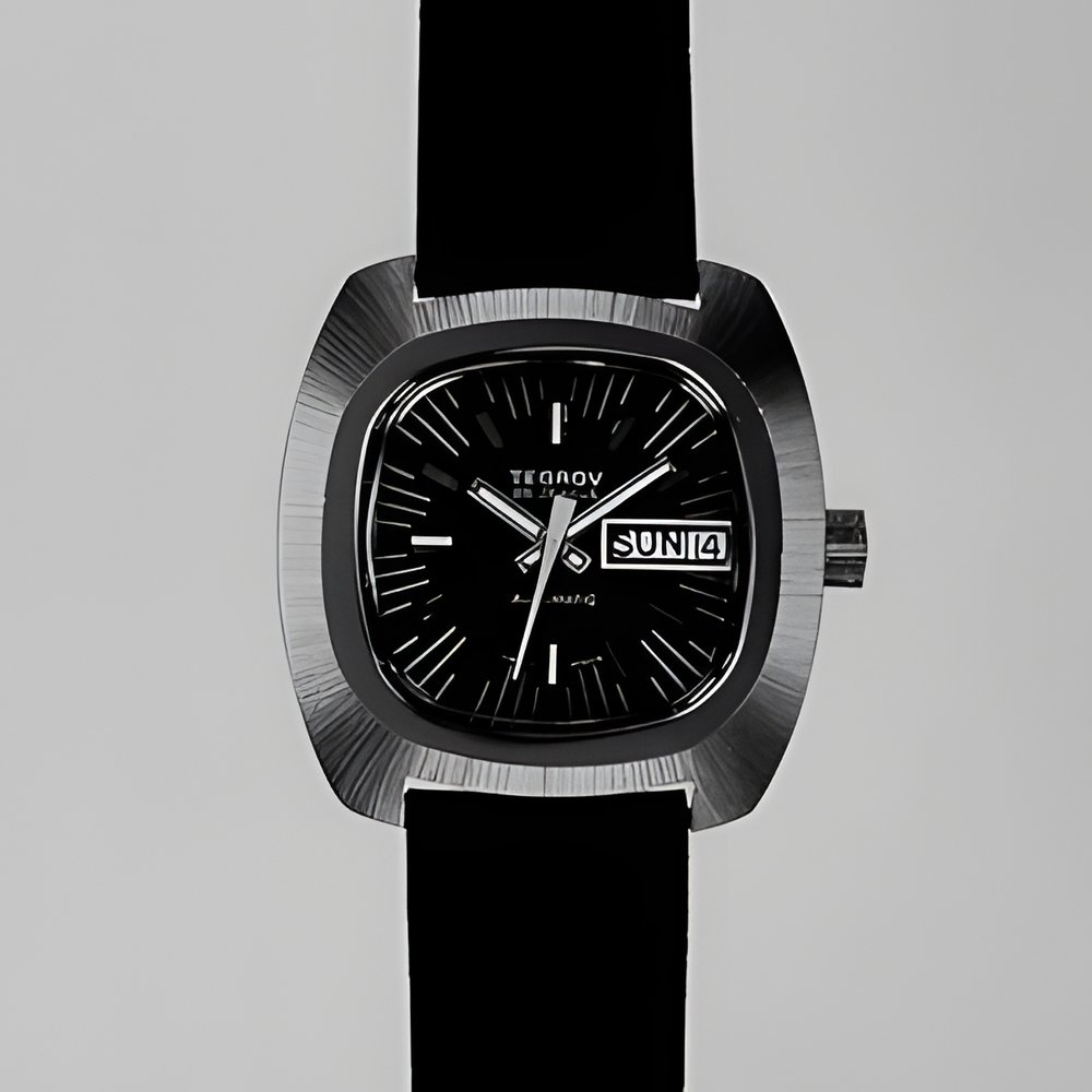 Economically priced but equipped with every modern feature : seliwinding movement, day and date calendar, shock-protection system, centre second hand. Water-resistant chromed case ; blue sunray finished dial with easy-to-read minute strokes. (SCHAUB-TEGROV)