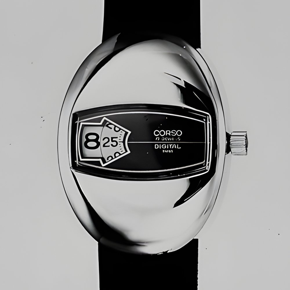 A “numeral” (or digital) watch with chromed or gilt water-resistait ae , brightly polished in the currently popular style. An economical model. (VIATOR - CORSO)