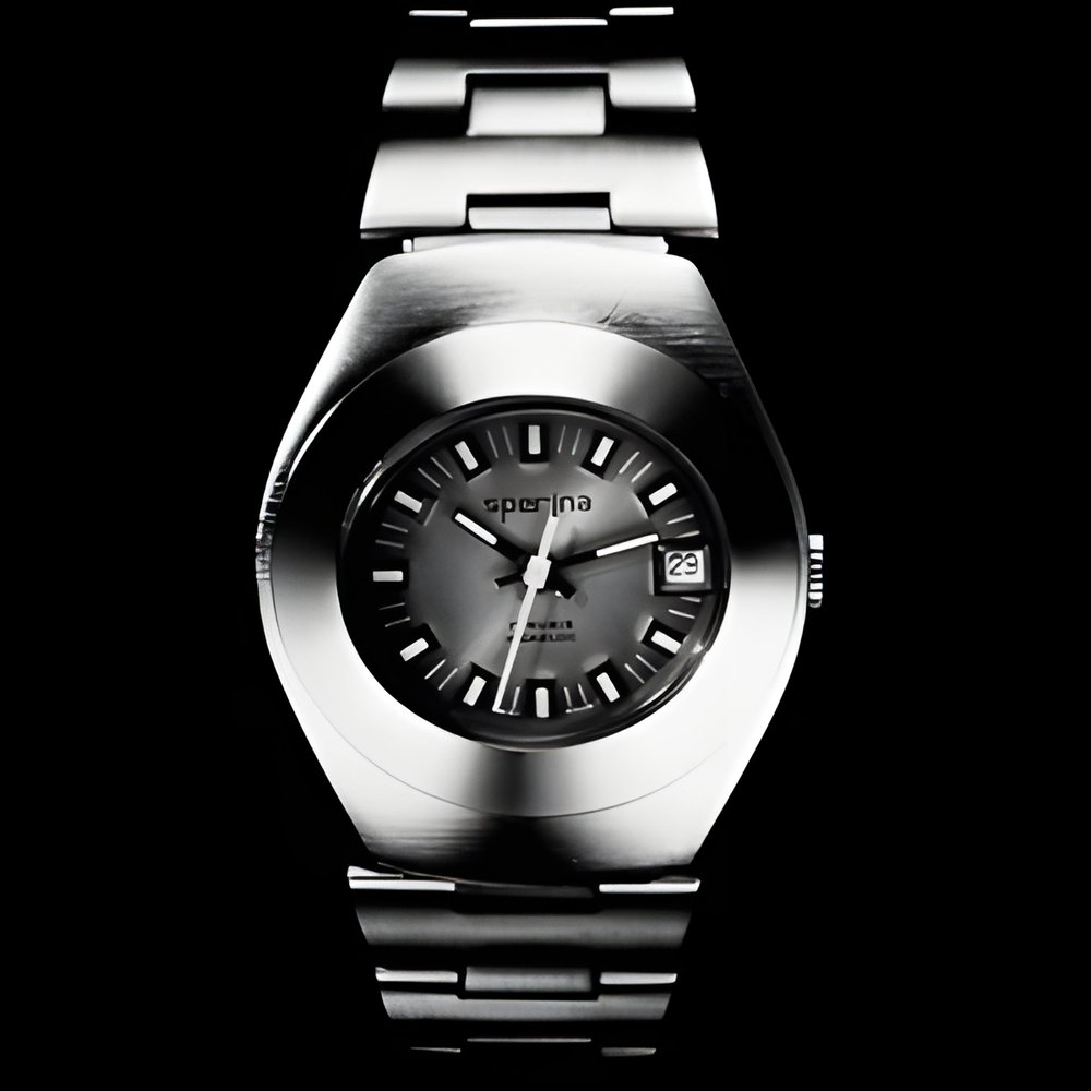 Very representative of today’s styling is this water-resistant watch in the “economical” class. Broad glossy surfaces and a bright and easy-to-read dial. With calendar and metal bracelet. (SPERINA)