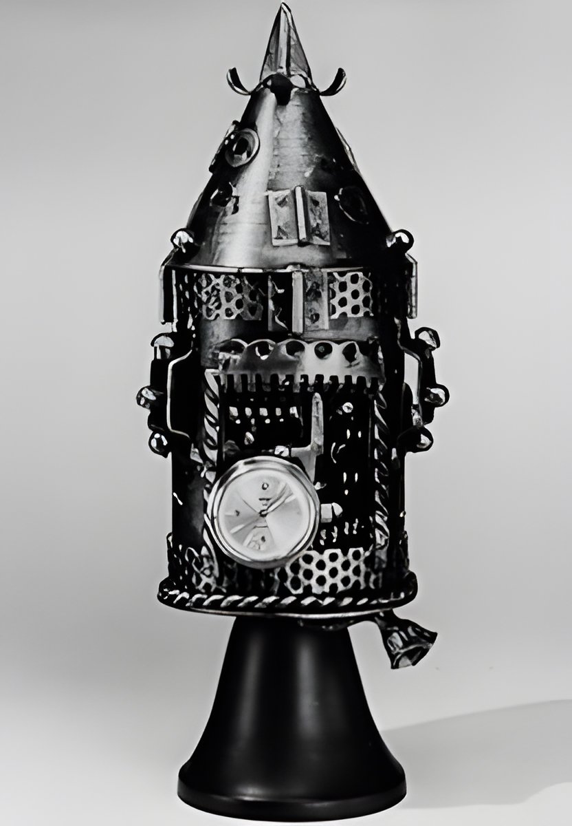 Small clock with matt-finished and blackened metal case with space capsule styling. Available either with battery-powered or manually wound alarm movement. An exclusive model. (OBERON)