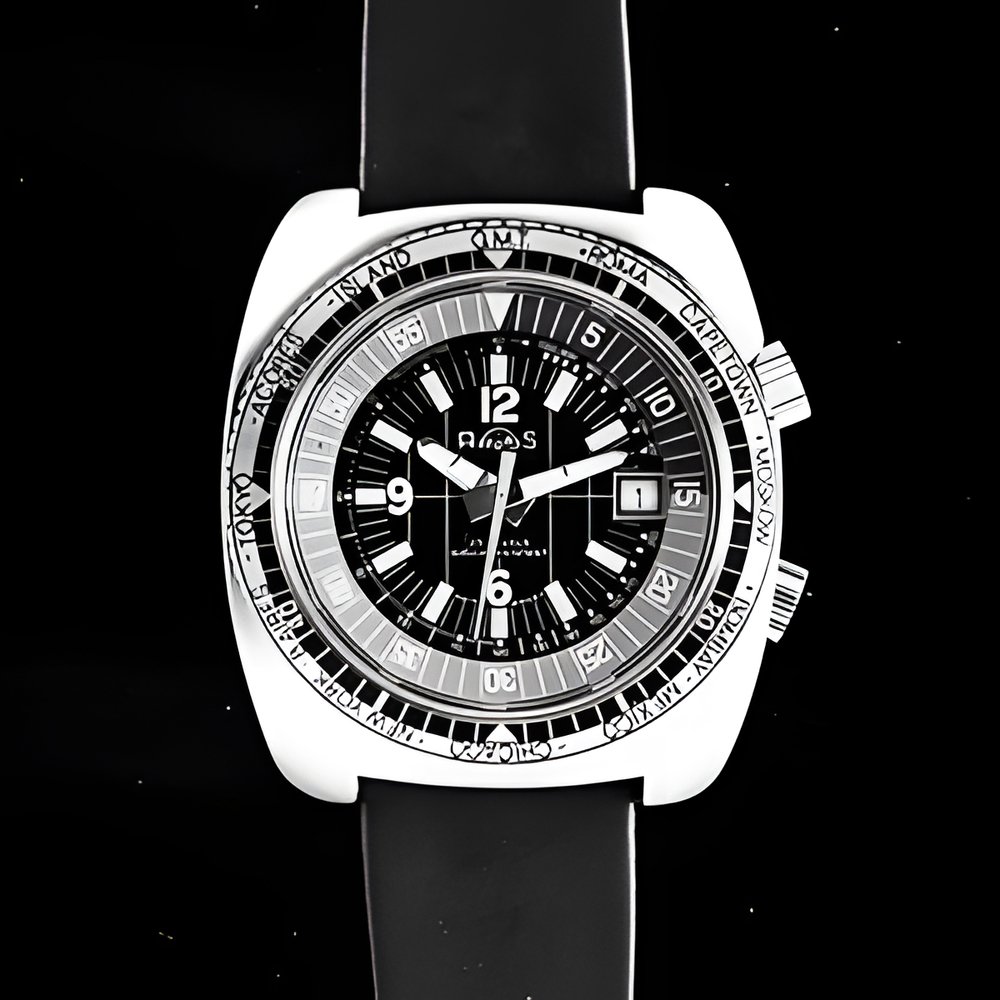 The multipurpose economical watch. Its inside turning bezel is particularly suited for measuring elapsed diving times but its divisions can be used to time other sports as well. Tachymetric scale and a turning ring rimming the case with which to read the time in cities abroad With calendar. (ARIOS)
