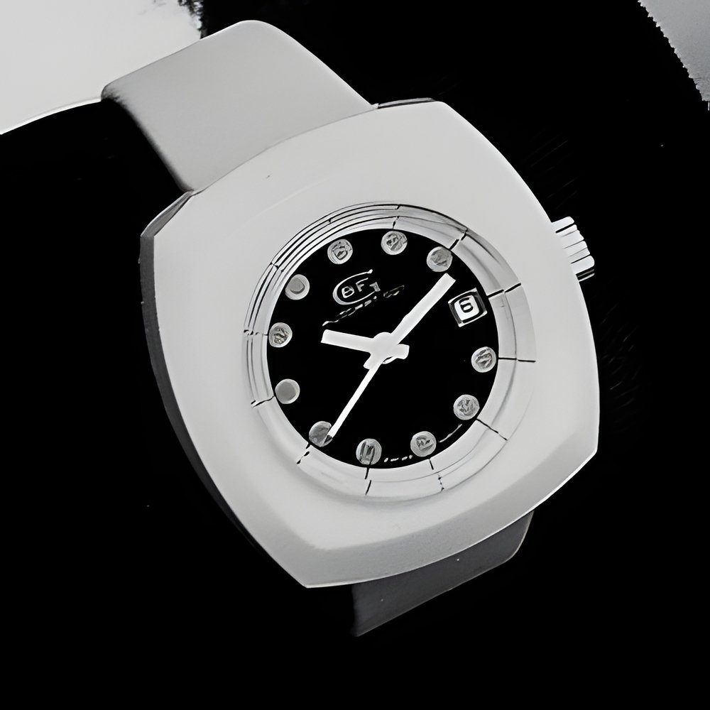 This very smart lady’s watch with coloured synthetic case is not only modern on the outside : the case contains the recently developed EFG 921 selfinding movement with a diameter of 21.9 mm only (9 (BAUMGARTNER FRERES S.A.)
