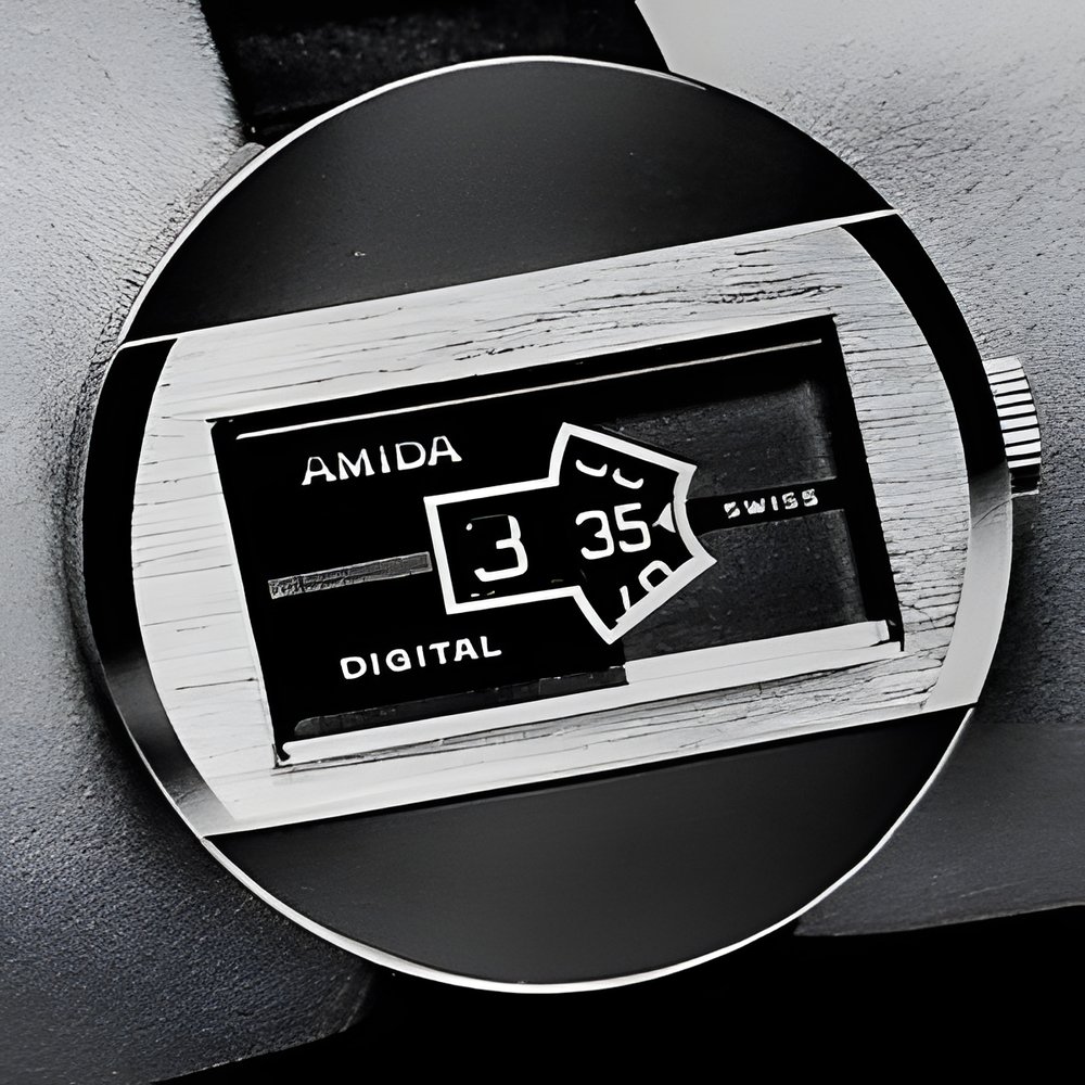 The most striking feature of this digital watch is the central positioning of the apertures showing the hours and the minutes. The rim of its chromed case is brightly polished. Brush-finished dial frame. (AMIDA - Digital)