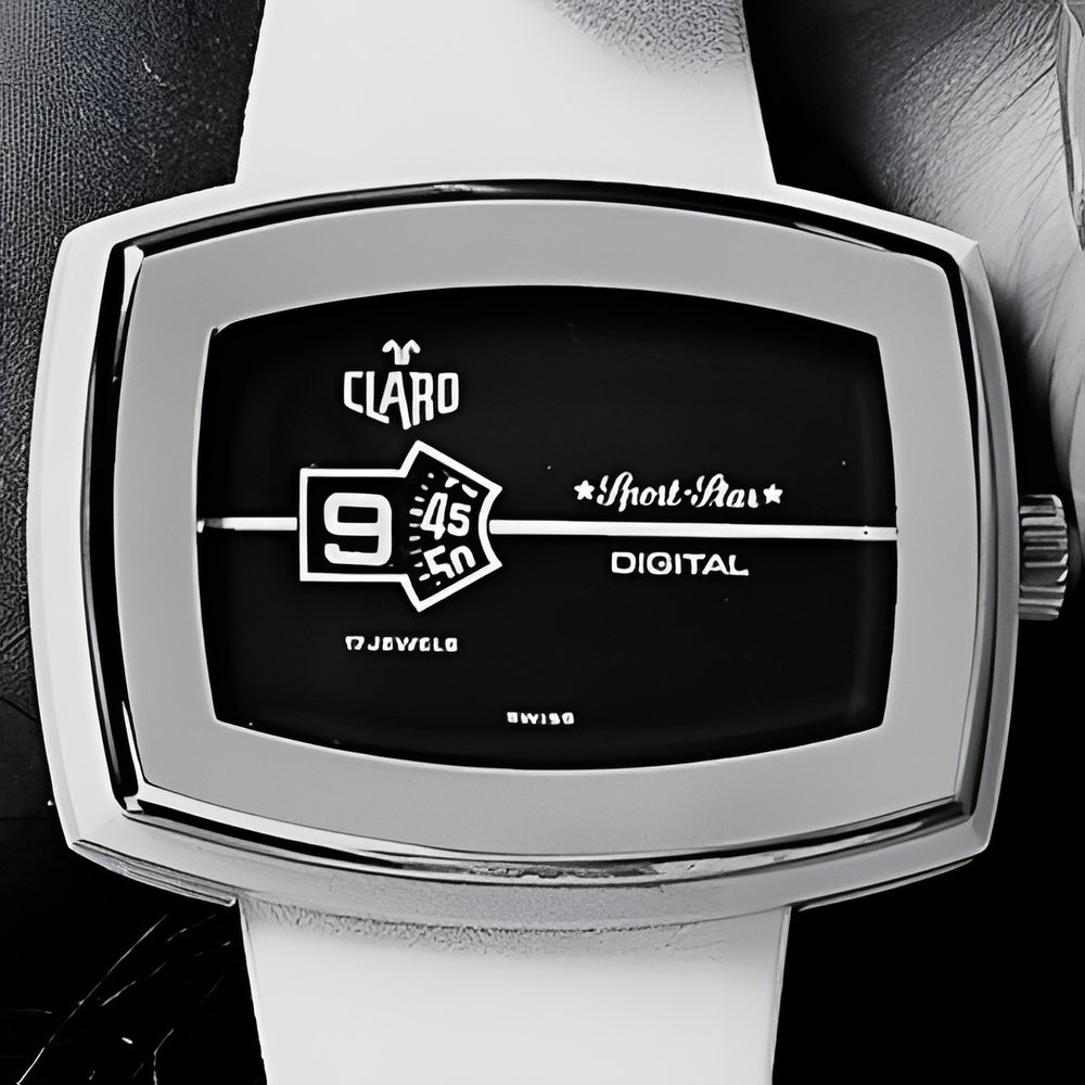appear as figures in large apertures framed by a blue dial. The case is made of Noryl, a synthetic material. Its water-resistance is tested to 5 atmospheres (a depth of 50 metres); with chromed bezel. (CLARO “Sport Star Digital”)
