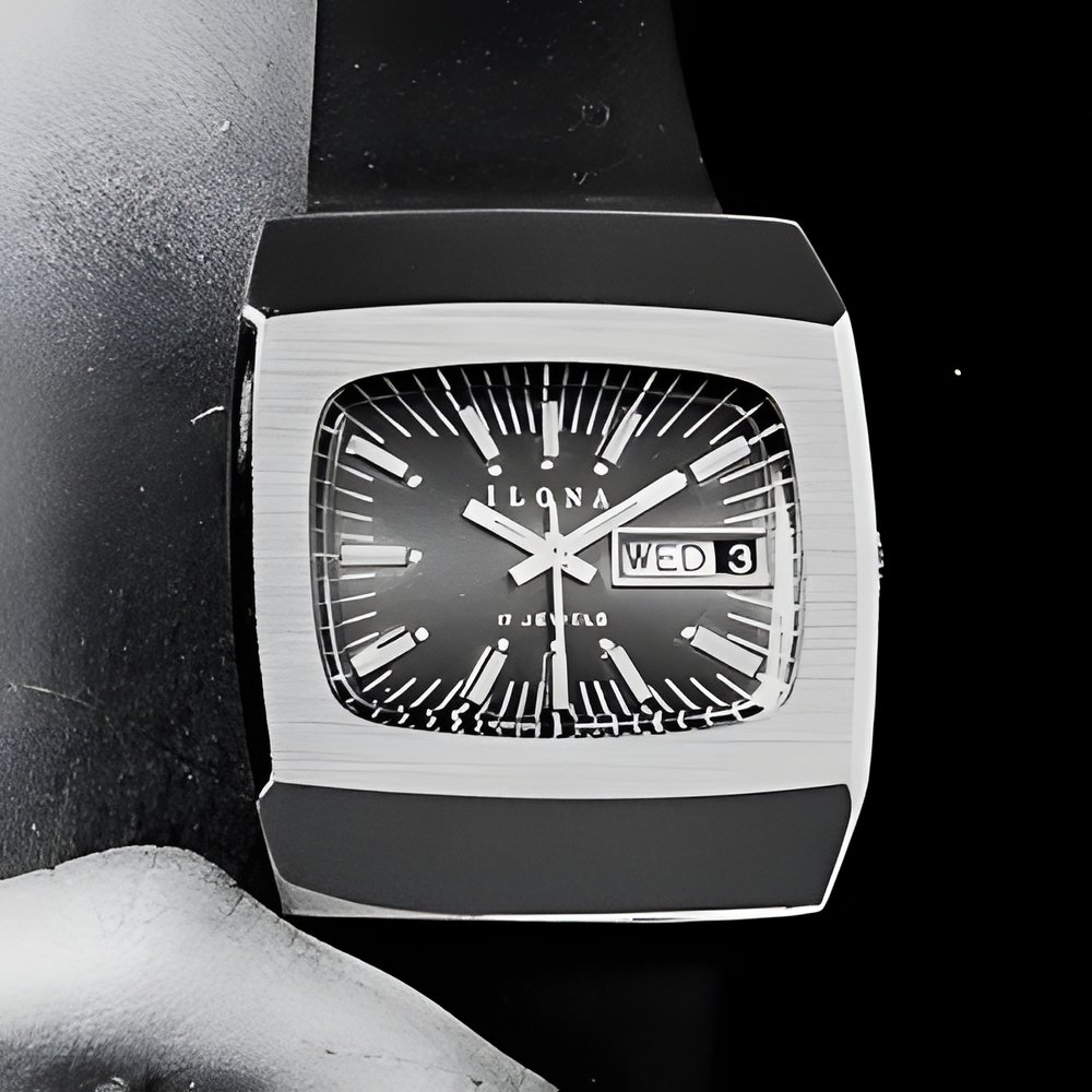 In the economic" category, this model displays up-to-the-minute styling. Its case has the wide polished surfaces so popul today contrasting with a brush-finished bezel. Coloured dial with sharp, legible minute circle. Day and date calendar. Available in chrome or gilt finish. (ILONA)