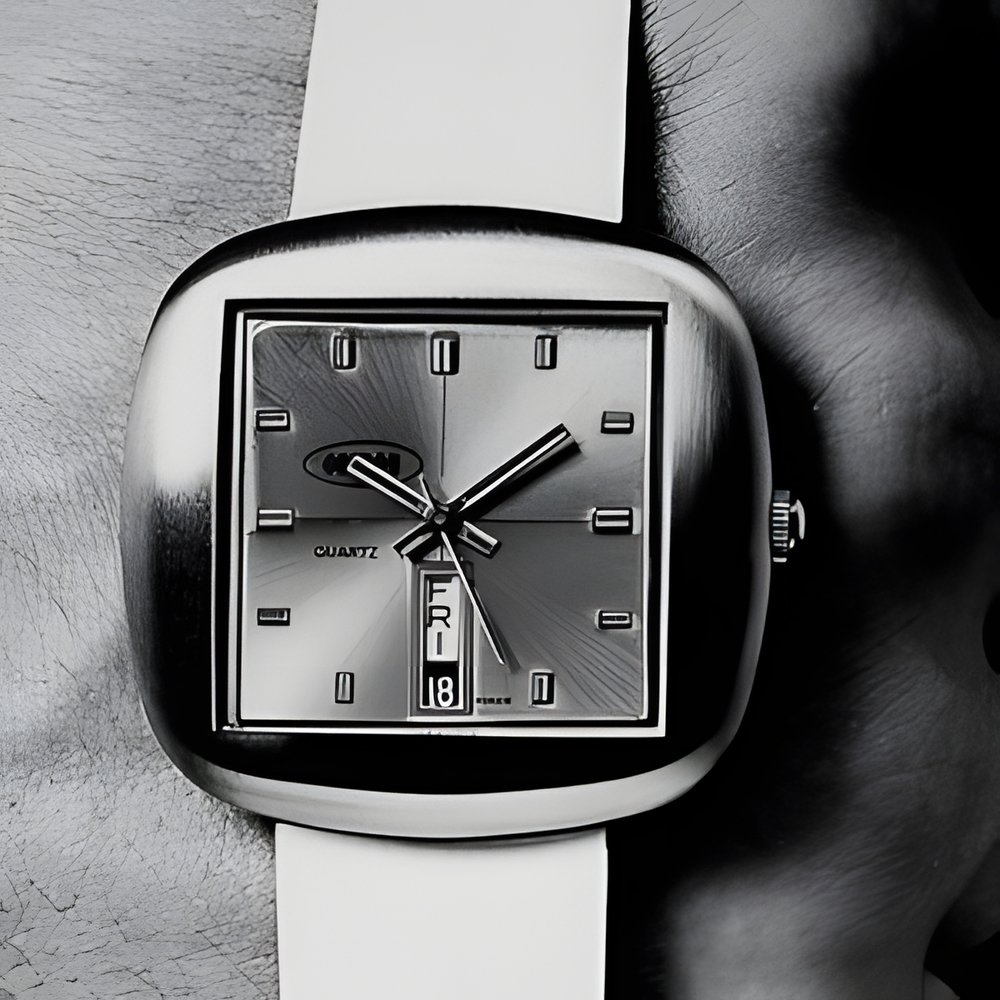 Surprises never end in Basle : quartz electronic wristwatches make their debut in the showcases of manufacturers of economical watches. Here is one of these new models its quartz vibrates at 32,768 Hertz, it has a stepping motor and a day and date calendar. The monthly variation is expressed in seconds. Large vater-resistant case with rounded sides. (OBERON - Quartz)