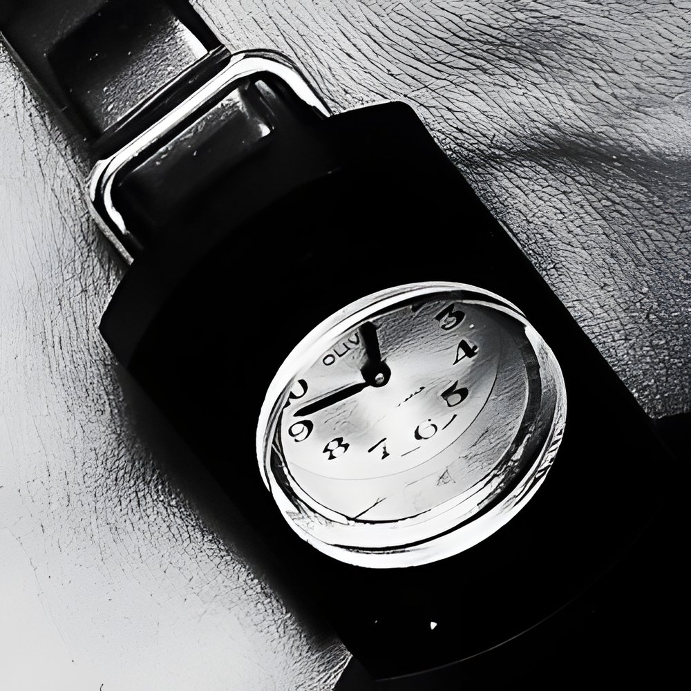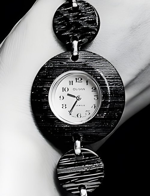 A “slave bracelet” watch - one of today’s favourite styles Rigid bracelet and broad-surface case made of imitation tortoise shell synthetic. The silvered dial has 12 “Breguet”-style black painted hour figures. An economical model (OLIVIA)