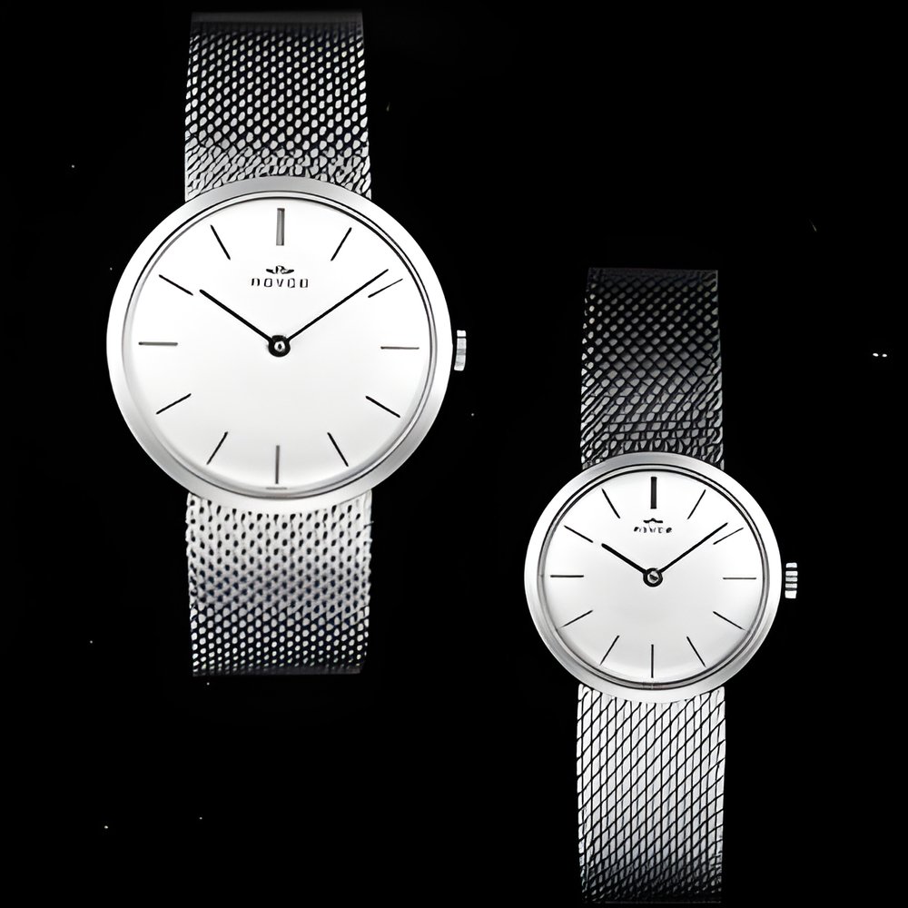 ’His and Hers“pairs are the rage - their simple lines accentuate these two models ’ family look. Very slim case profile ; in stainless steel as is the bracelet silvered dials with gold hour appliques (ROYCE”St Moritz")