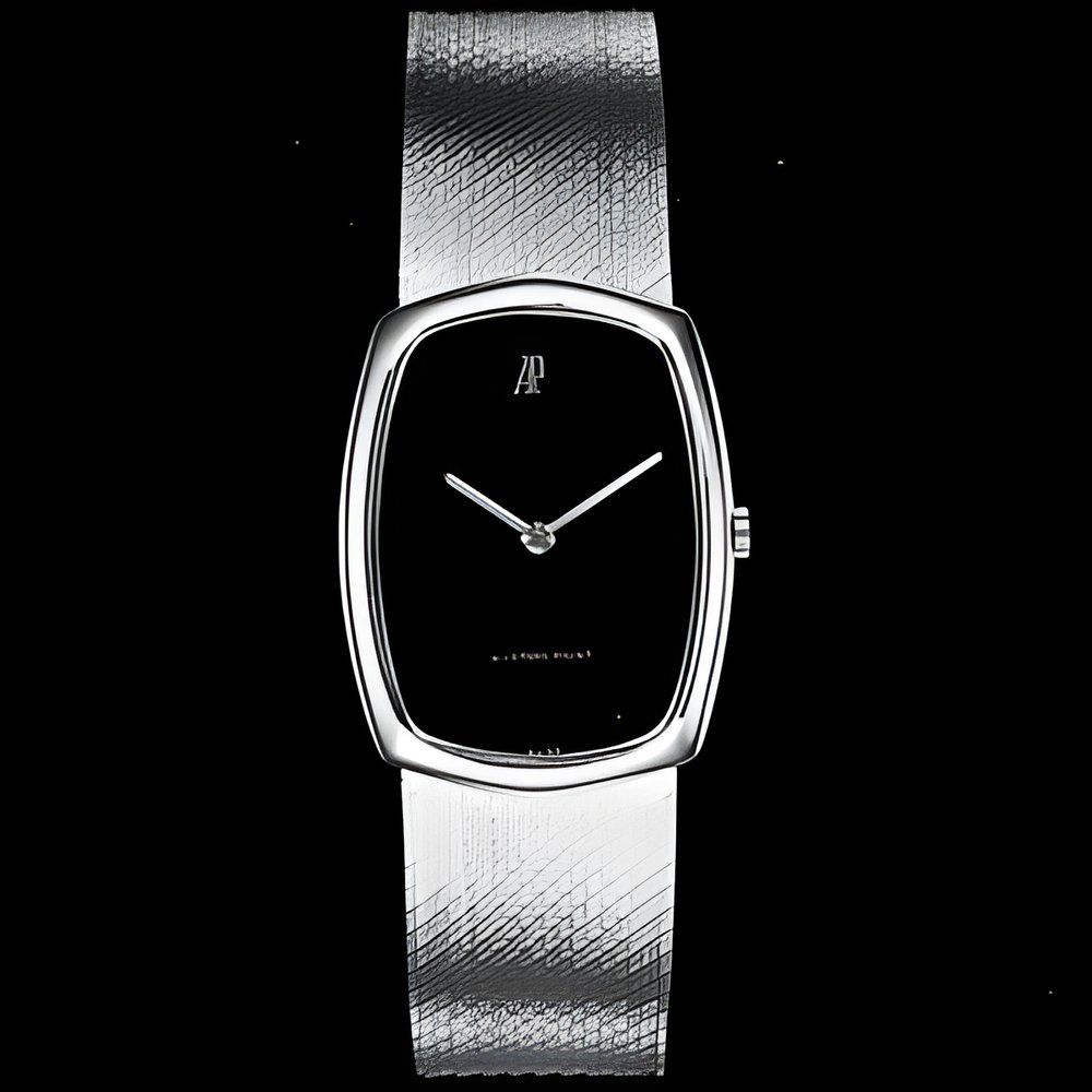 watch’s supple ’white gold bracelet blends smoothly into the case whose rounded angles and curved sides reflect the “romantic” style. Blue dial devoid of figures or markers. (AUDEMARS PIGUET)