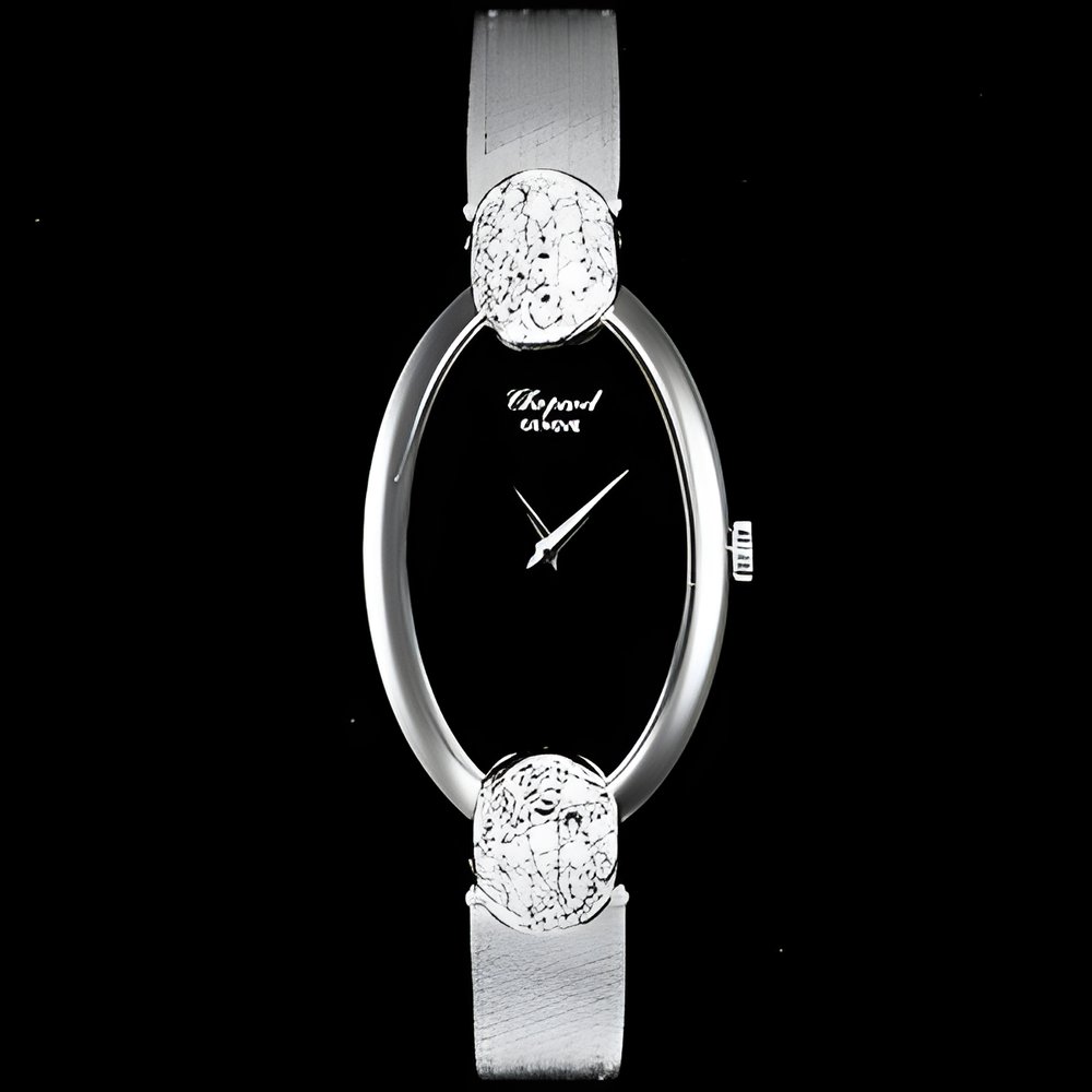 A very “romantically” styled lady’s evening watch in 18 Ct. white gold. Oval case with rounded flanks delicate and very flexible gold bracelet joined to the case by two motifs set with 48 brilliants Onyx dial. (CHOPARD)