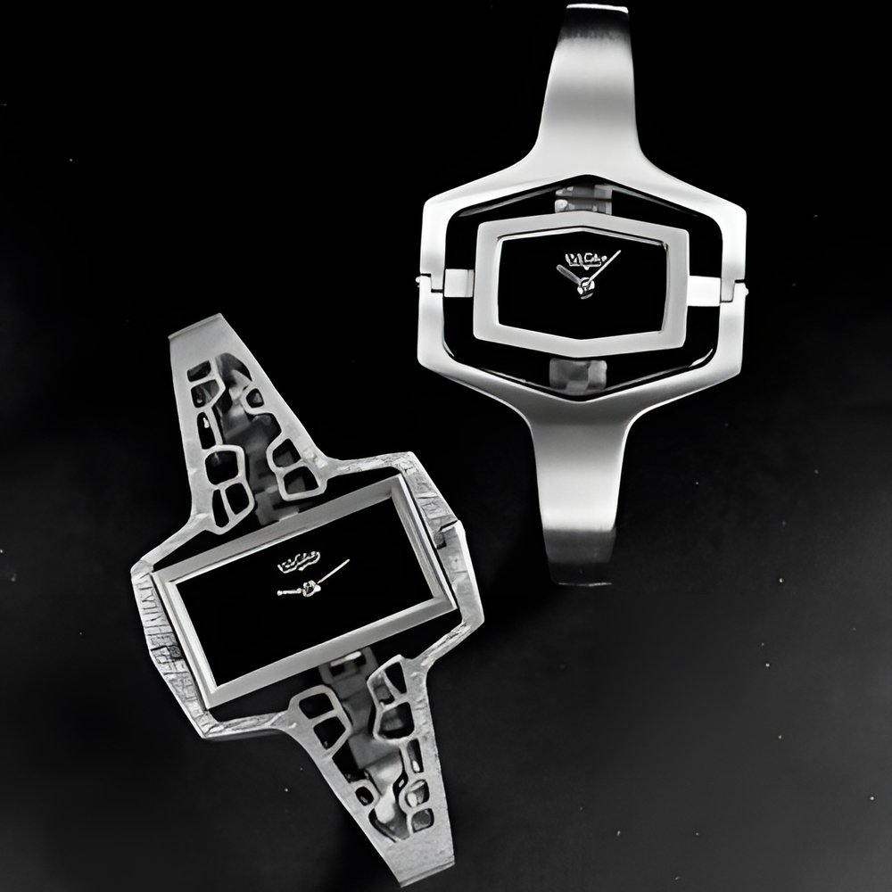 Rigid bracelets are most fashionable these days The to models shown here incorporate an original adjustment system for the wrist : a hinge is built into the bracelet along its transversal axis (3 o’clock - 9 o’clock) - a novel idea indeed. In yellow or grey goldplate. (VULCAIN)