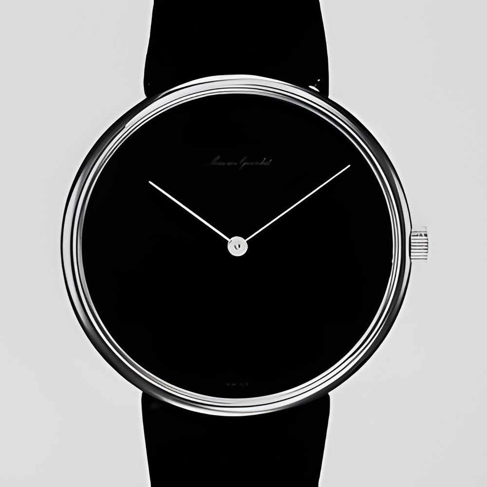 Serenely restrained styling for this large diameter (47 mm) watch with black dial and one-piece case having the softly rounded flanks now in vogue. (MAURICE GUERDAT)