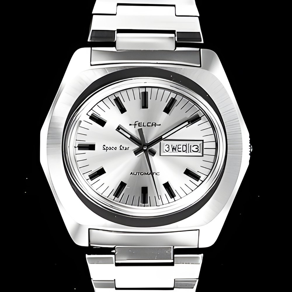 Most representative of contemporary meni s watches : ruggedly masculine look tempered by rounded lines, a wide dial with sharply legible index, integrated bracelet and case Automatic movement with day and date calendar. Water-resistant case. (FELCA-TITONI “Space Star”)