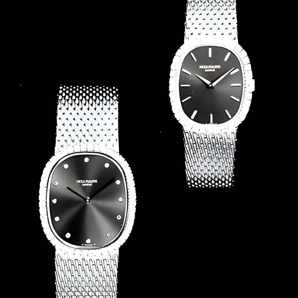 Luxury watches also come in pairs. These two Patek Philippe jewellery watches are in 18 carat grey gold and their dial is made of blue gold, with the hours on one of them being marked by brilliants. The graceful lines of these “Cercle d’Or” models are also diamond-rimmed. In all, 2.33 carats of diamonds of the finest water. (PATEK PHILIPPE)