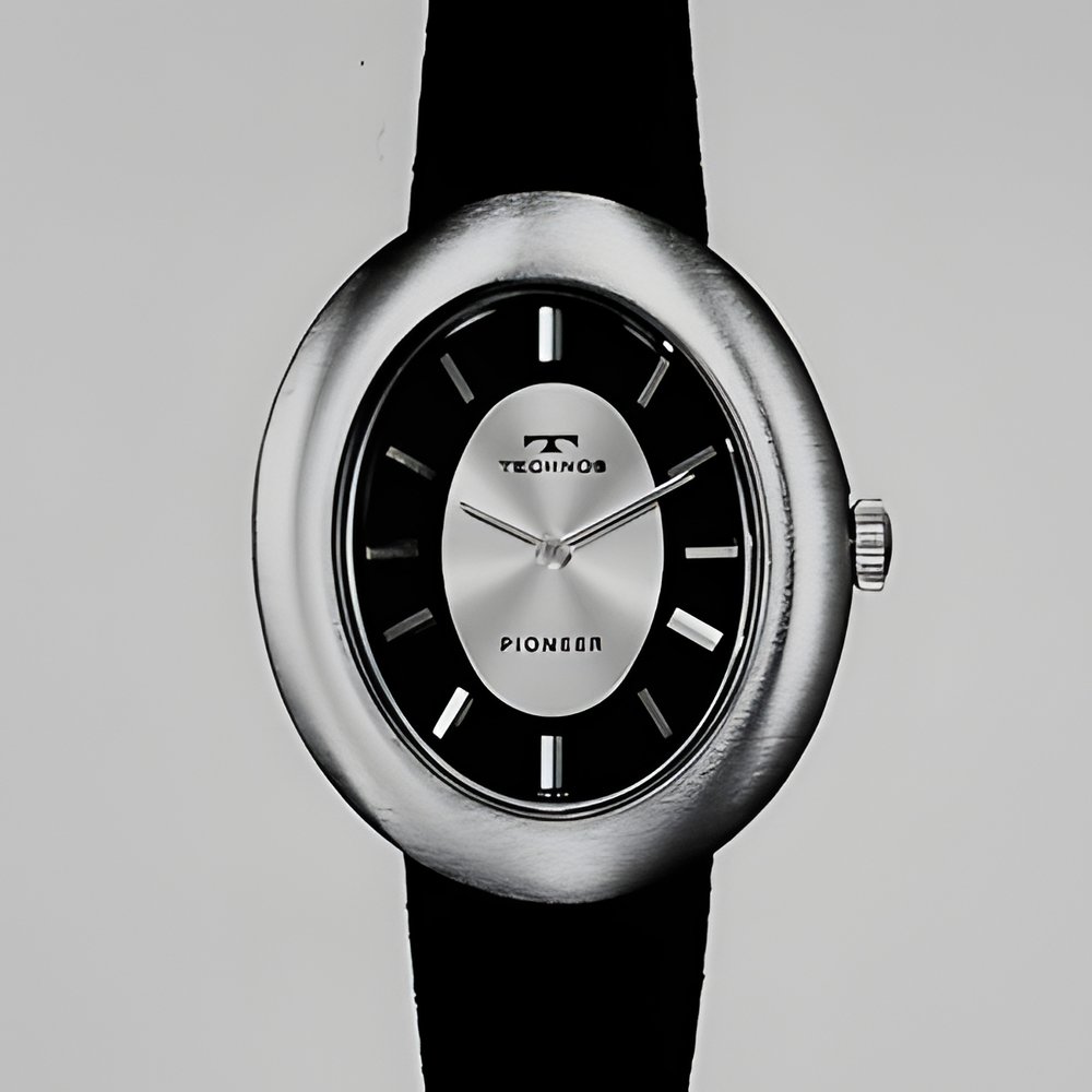 Oval case with polished rounded sides and tvo-tone dial polished gilt centre, black lacquered rim and raised hour markers - an uncompromisingly youthful model available in goldplate or chrome finish Very representative of the new Technos Pioneer collection. (TECHNOS “Pioneer”)