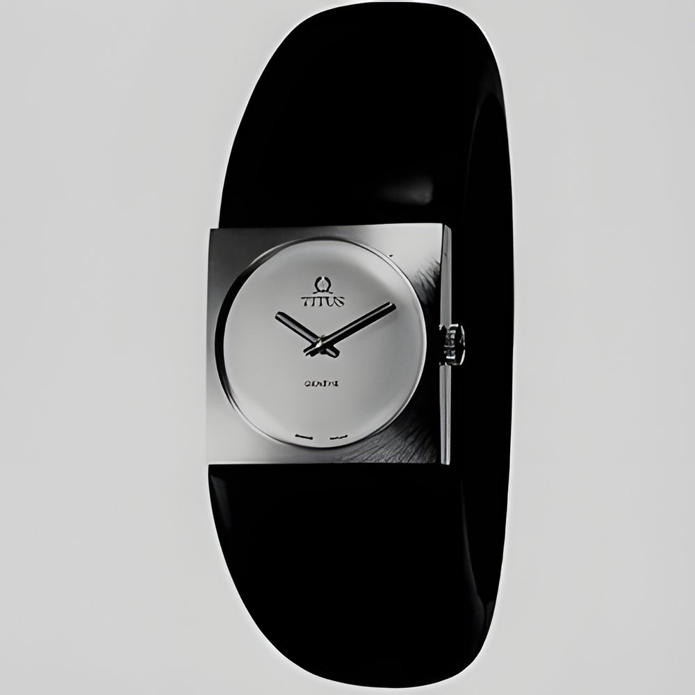 This model embodies two major contemporary watch fashion trends: a rigid “slave-type” bracelet and new materials, here wood. With broad gilt dial devoid of figures. A model designed for the younger generation. (SOLVIL & TITUS)